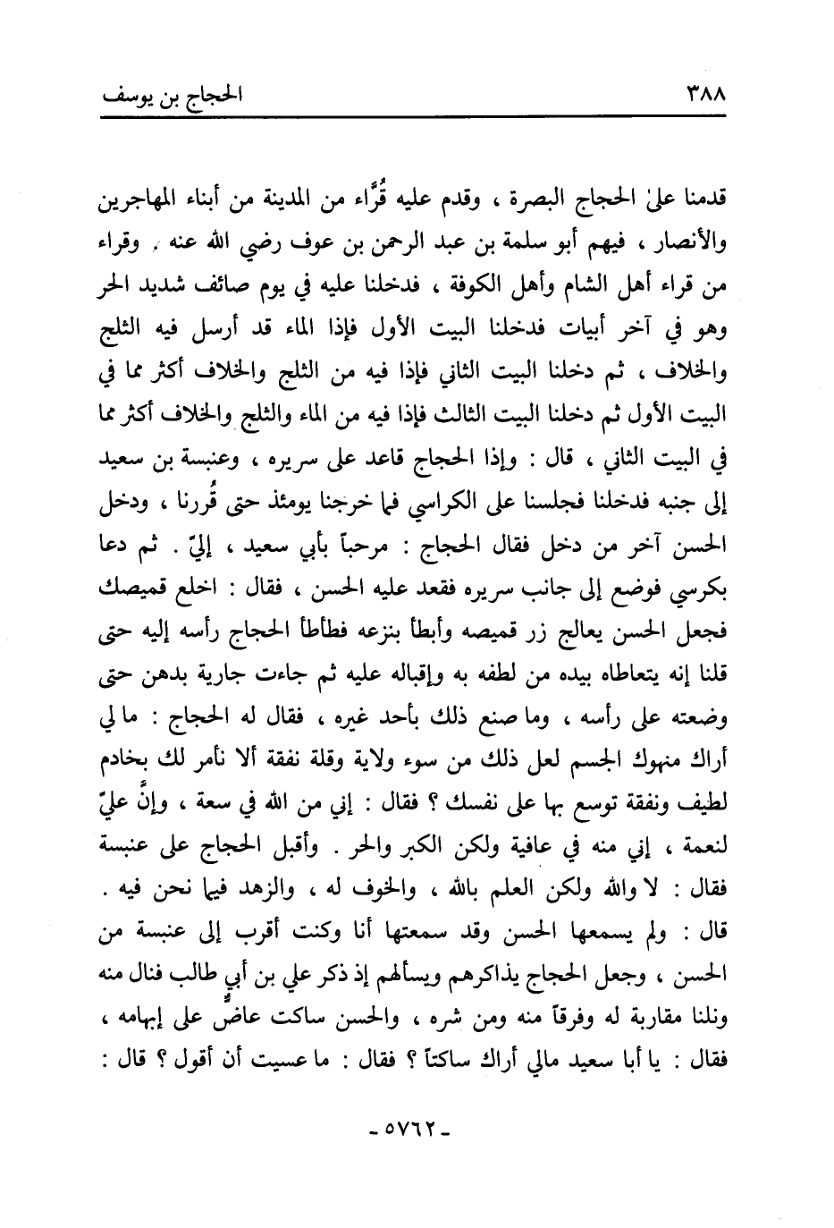 قدمنا عَلَى الحجاج البصرة، وقدم عَلَيْهِ قُرَّاء من المدينة من أبناء المهاجرين والأنصار، فيهم أَبُو سَلَمة بْن عَبْد الرَّحْمَن بْن عوف رَضِي اللَّه عَنْهُ. وقراء من قراء أهل الشام وأهل الكوفة، فدخلنا عَلَيْهِ فِي يَوْم صائف شديد الحر وهو فِي آخر أبيات فدخلنا البيت الأول فإذا الماء قَدْ أرسل فِيهِ الثلج والخلاف، ثُمَّ دخلنا البيت الثَّاني فإذا فِيهِ من الثلج والخلاف أكثر مما في البيت الأول ثم دخلنا البيت الثالث فإذا فِيهِ من الماء والثلج والخلاف أكثر مما فِي البيت الثَّاني، قَالَ: وإذا الحجاج قاعد عَلَى سريره، وعنبسة بْن سَعِيد إلى جنبه فدخلنا فجلسنا عَلَى الكراسي فما خرجنا يومئذ حتَّى قُررنا، ودخل الْحَسَن آخر من دخل فَقَالَ الحجاج: مرحبًا بأبي سَعِيد، إليَّ. ثُمَّ دعا بكرسي فوضع إلى جانب سريره فقعد عَلَيْهِ الْحَسَن، فَقَالَ: اخلع قميصك فجعل الحسن يعالج زرقميصه وأبطأ بنزعه فطأطأ الحجاج رأسه إليه حتَّى قلنا إنه يتعاطاه بيده من لطفه بِهِ وإقباله عَلَيْهِ ثُمَّ جاءت جارية بدهن حتَّى وضعته عَلَى رأسه، وما صنع ذَلِكَ بأحد غيره، فَقَالَ لَهُ الحجاج: ما لي أراك منهوك الجسم لعل ذَلِكَ من سوء ولاية وقلة نفقة ألا نأمر لَكَ بخادم لطيف ونفقة توسع بها عَلَى نفسك؟ فَقَالَ: إني من اللَّه فِي سعة، وإنَّ عليّ لنعمة، إني مِنْهُ فِي عافية ولكن الكبر والحر. وأقبل الحجاج عَلَى عنبسة فَقَالَ: لا والله ولكن العلم بالله، والخوف لَهُ، والزهد فيما نَحْنُ فيه.