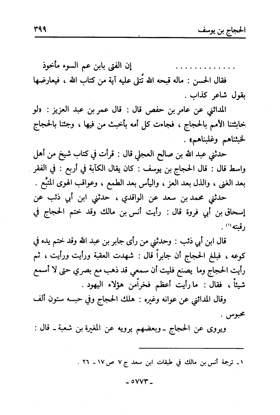 حَدَّثَنِي مُحَمَّدُ بنُ سَعْدٍ عَنِ الْوَاقِدِيِّ، حَدَّثَنِي ابْنُ أَبِي ذِئْبٍ عَنْ إِسْحَاقَ بْنِ أَبِي فَرْوَةَ قَالَ: رَأَيْتُ أَنَسَ بْنَ مَالِكٍ وَقَدْ خَتَمَ الْحَجَّاجُ فِي رَقَبَتِهِ [1] .