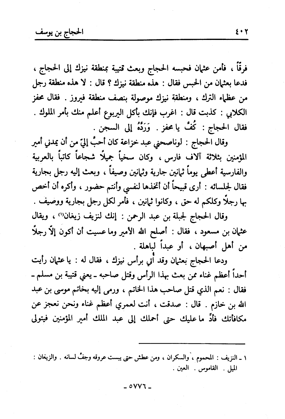 وقَالَ الحجاج لجبلة بْن عَبْد الرَّحْمَن: إنك لنزيف زيغان [1] ، وَيُقَال عثمان بْن مَسْعُود، فَقَالَ: أصلح اللَّه الأمير وما عسيت أن أكون إلّا رجلًا من أهل أصبهان، أَوْ عبدًا لباهلة.
