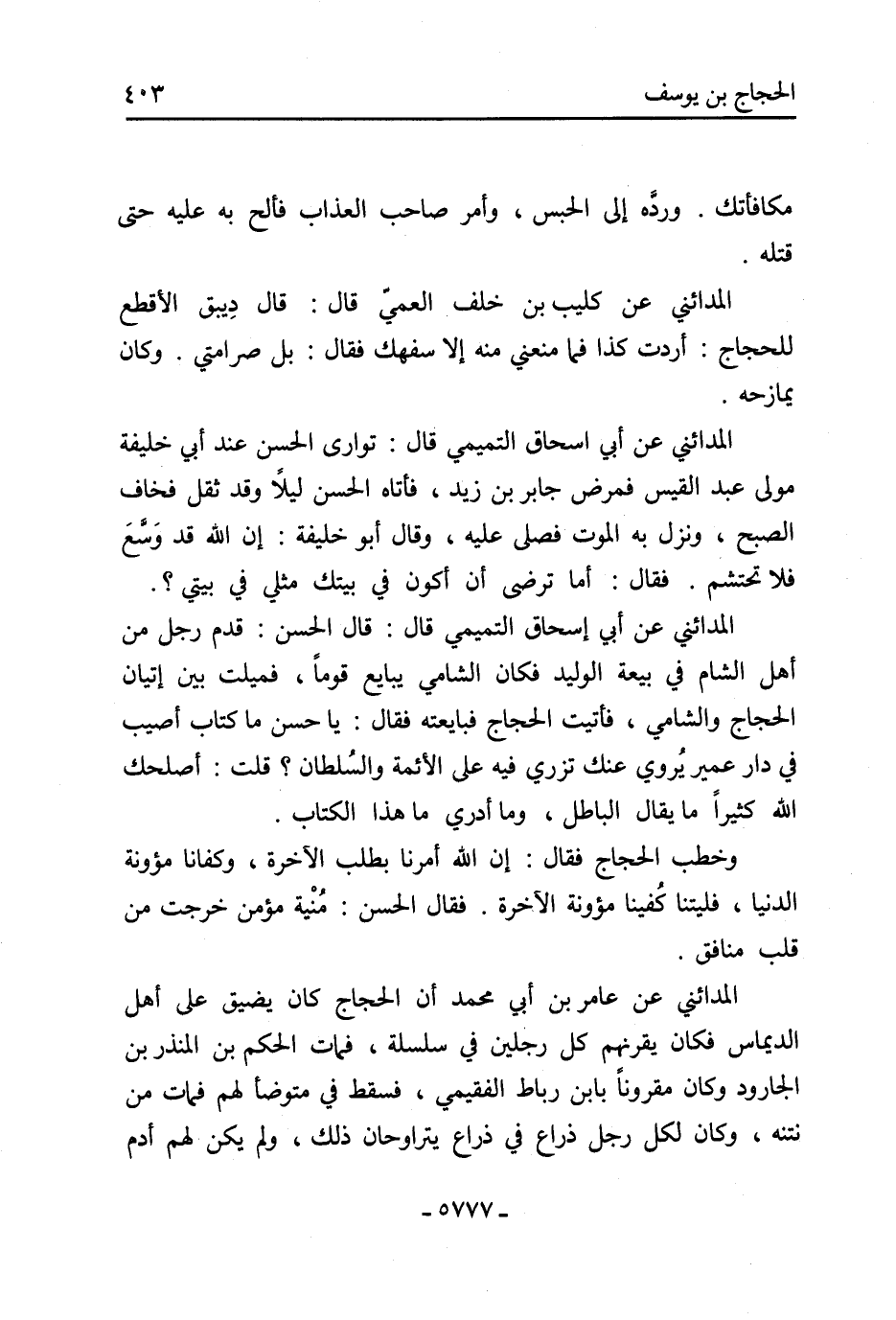 المدائني عن أَبِي إِسْحَاق التميمي قَالَ: قَالَ الْحَسَن: قدم رَجُل من أهل الشام فِي بيعة الوليد فكان الشامي يبايع قومًا، فميلت بين إتيان الحجاج والشامي، فأتيت الحجاج فبايعته فَقَالَ: يا حسن ما كتاب أصيب فِي دار عمير يُروي عنك تزري فِيهِ عَلَى الأئمة والسُلطان؟ قلت: أصلحك اللَّه كثيرًا ما يُقال الباطل، وما أدري ما هَذَا الكتاب.