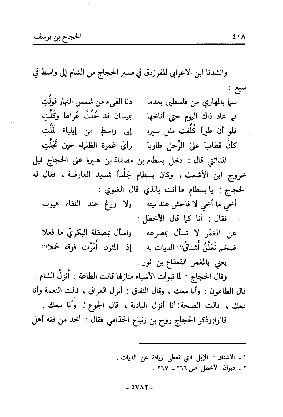 وأنشدنا ابْنُ الأعرابي للفرزدق فِي مسير الحجاج من الشام إلى واسط فِي سبع: