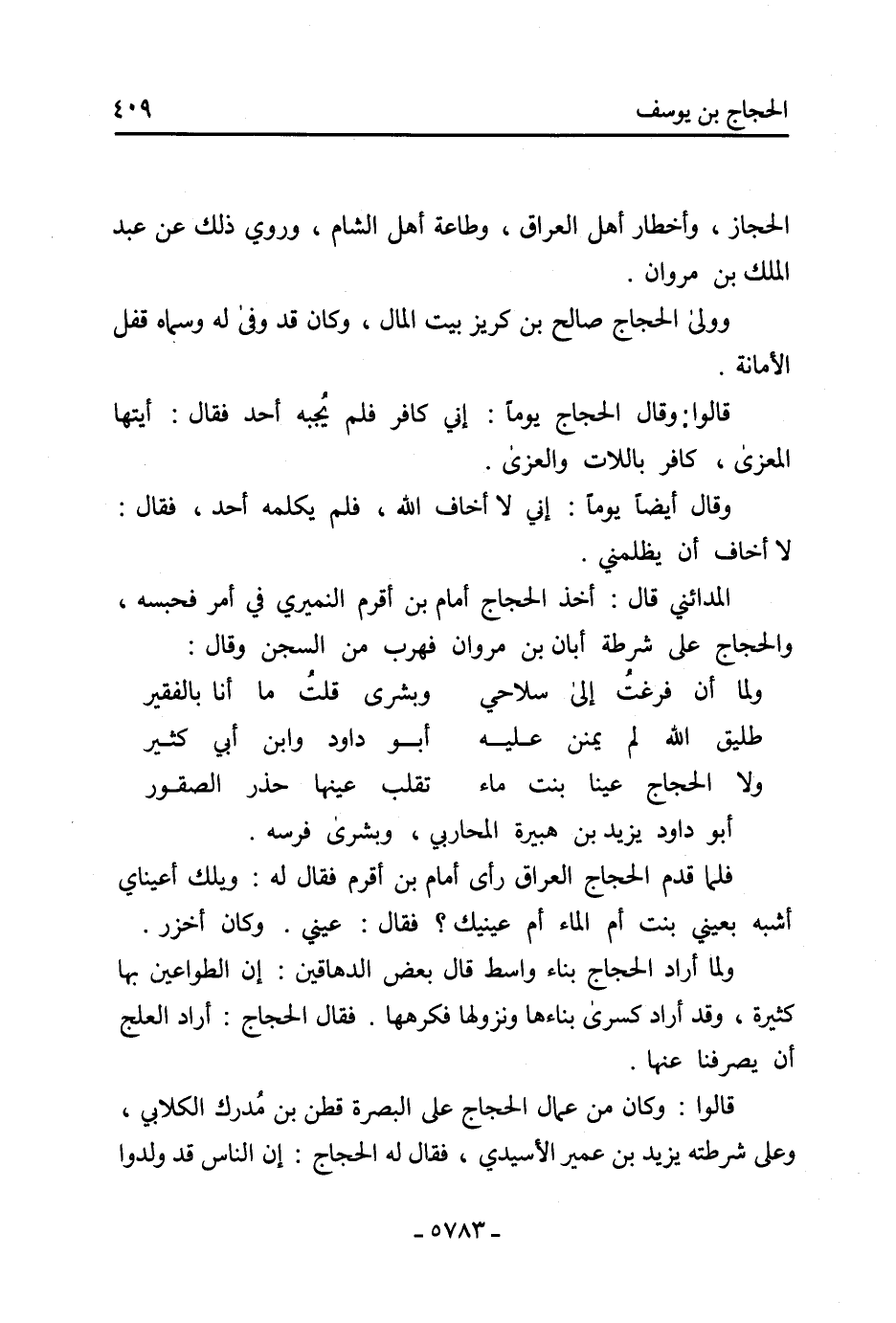 قَالُوا: وقَالَ الحجاج يومًا: إني كافر فلم يُجبه أحد فَقَالَ: أيتها المعزى، كافر باللات والعزى.