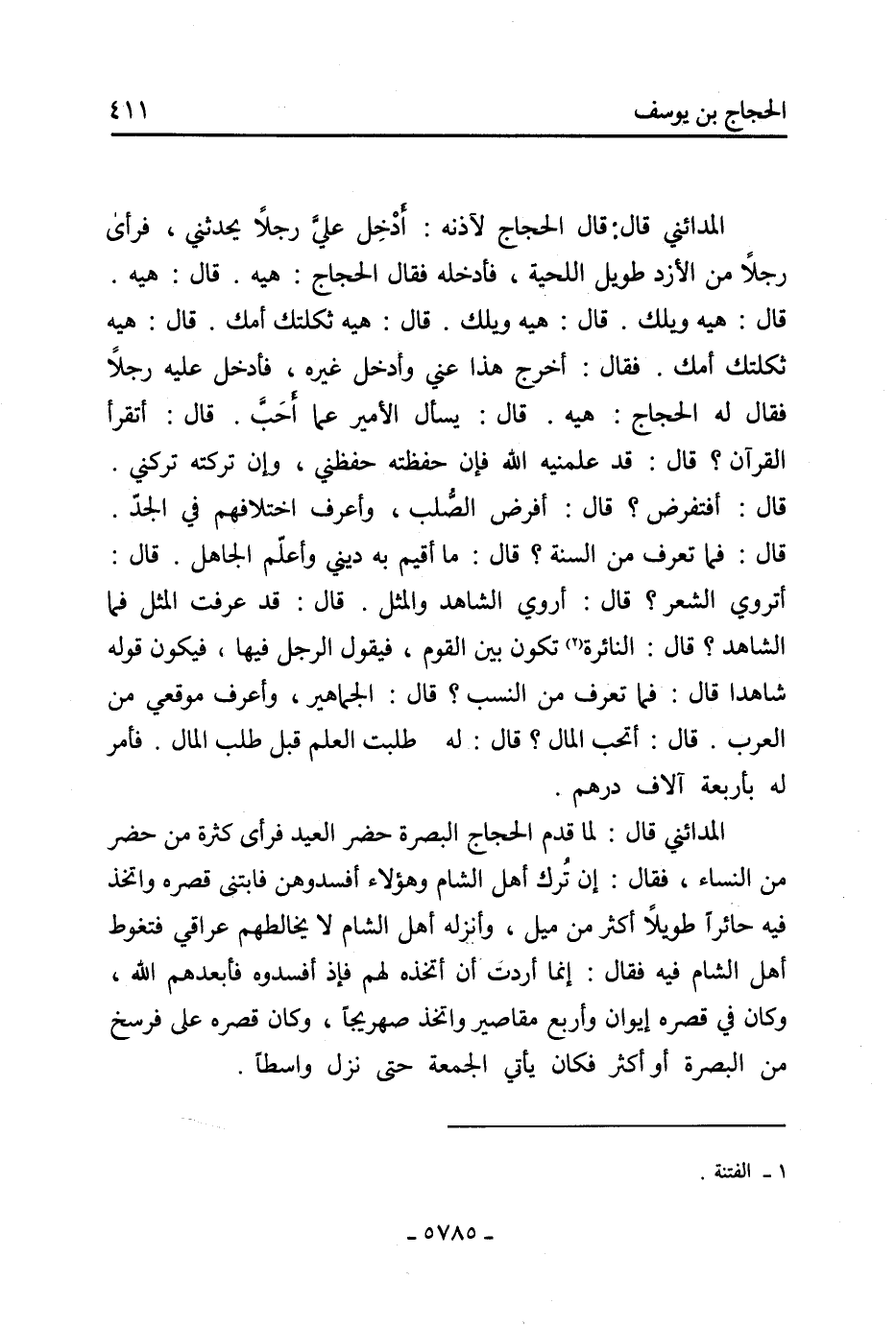 المدائني قَالَ: قَالَ الحجاج لآذنه: أَدْخِل عليّ رجلًا يحدثني، فرأى رجلًا من الأزد طويل اللحية، فأدخله فَقَالَ الحجاج: هيه. قَالَ: هيه.