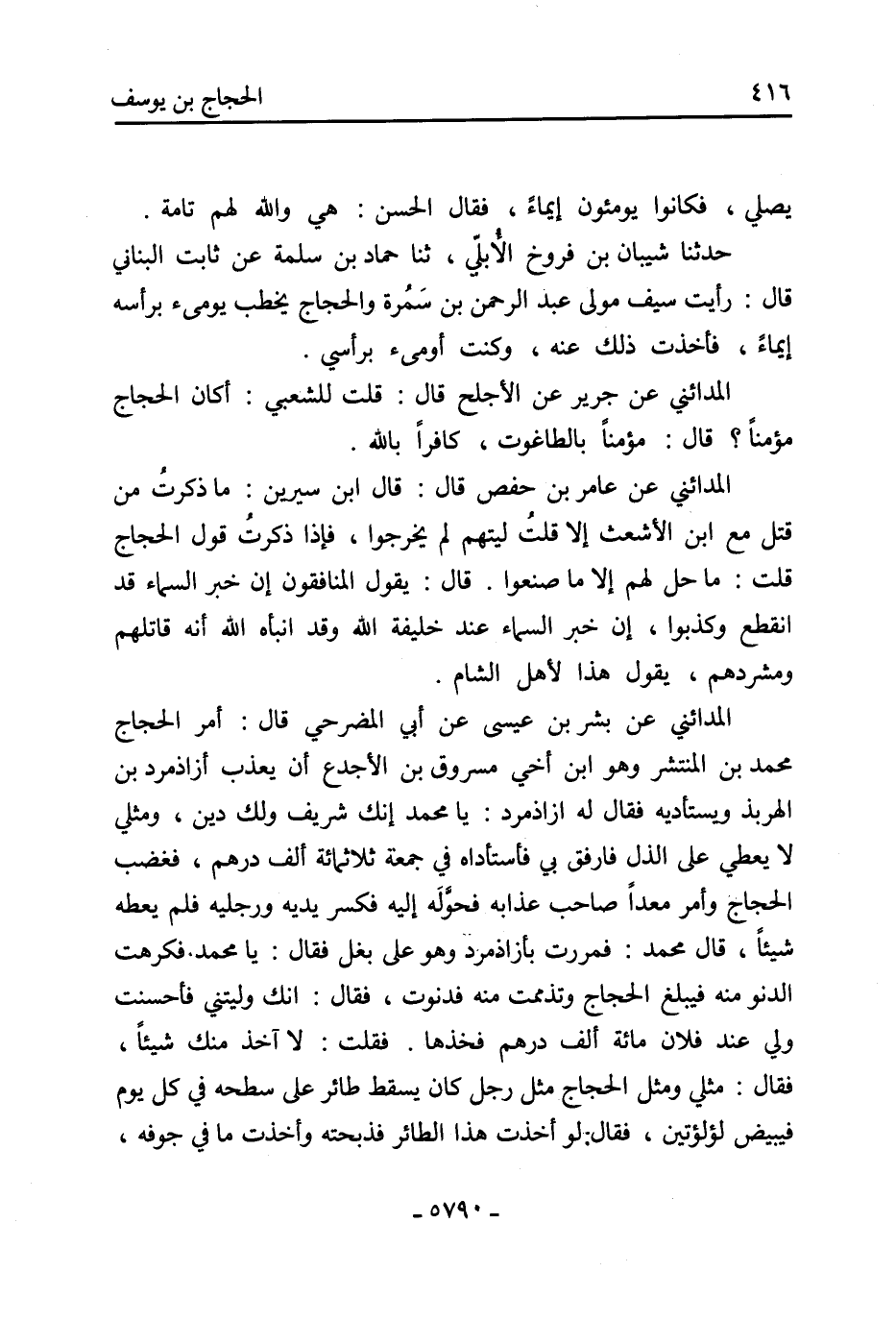 المدائني عن جرير عن الأجلح قَالَ: قلت للشعبي: أكان الحجاج مؤمنًا؟ قَالَ: مؤمنًا بالطاغوت، كافرًا بالله.