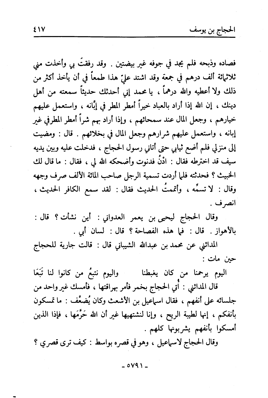 فصاده وذبحه فلم يجد فِي جوفه غير بيضتين. وقد رفقت بي وأخذت مني ثلاثمائة ألف درهم فِي جمعة وَقَدِ اشتد عليّ هذا طمعا فِي أن يأخذ أكثر من ذَلِكَ ولا أعطيه والله درهمًا، يا مُحَمَّد إني أحدثك حديثًا سمعته من أهل دينك، إن اللَّه إِذَا أراد بالعباد خيرًا أمطر المطر فِي إبَّانه، واستعمل عليهم خيارهم، وجعل المال عند سمحائهم، وإذا أراد بهم شرًا أمطر المطر فِي غير إبانه، واستعمل عَلَيْهِم شرارهم وجعل المال فِي بخلائهم. قَالَ: ومضيت إلى منزلي فلم أضع ثيابي حتَّى أتاني رَسُول الحجاج، فدخلت عَلَيْهِ وبين يديه سيف قَدِ اخترطه فَقَالَ: ادْنُ فدنوت وأضحكه اللَّه لي، فَقَالَ: ما قَالَ لَكَ الخبيث؟ فحدثته فلما أردت تسمية الرجل صاحب المائة الألف صرف وجهه وقَالَ: لا تسمِّه، وأتممتُ الحديث فَقَالَ: لقد سَمِعَ الكافر الحديث، انصرف.