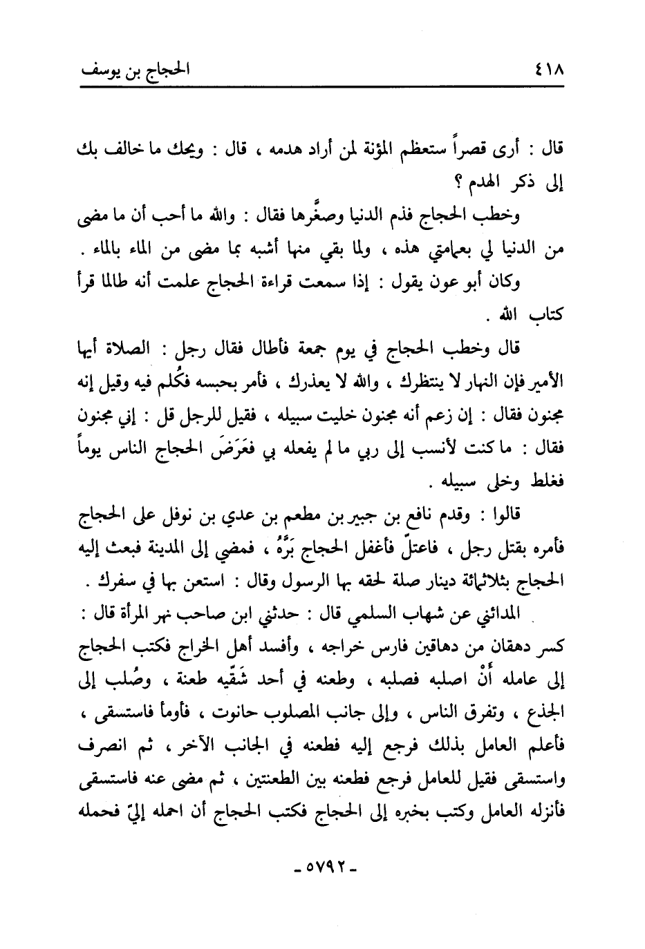 قَالَ وخطب الحجاج فِي يَوْم جمعة فأطال فَقَالَ رَجُل: الصلاة أيها الأمير فإن النهار لا ينتظرك، والله لا يعذرك، فأمر بحبسه فكُلم فِيهِ وقيل إنه مجنون فَقَالَ: إن زعم أَنَّهُ مجنون خليت سبيله، فقيل للرجل قل: إني مجنون فَقَالَ: ما كنت لأنسب إلى ربي ما لم يفعله بي فعَرَضَ الحجاج النَّاس يومًا فغلط وخلى سبيله.