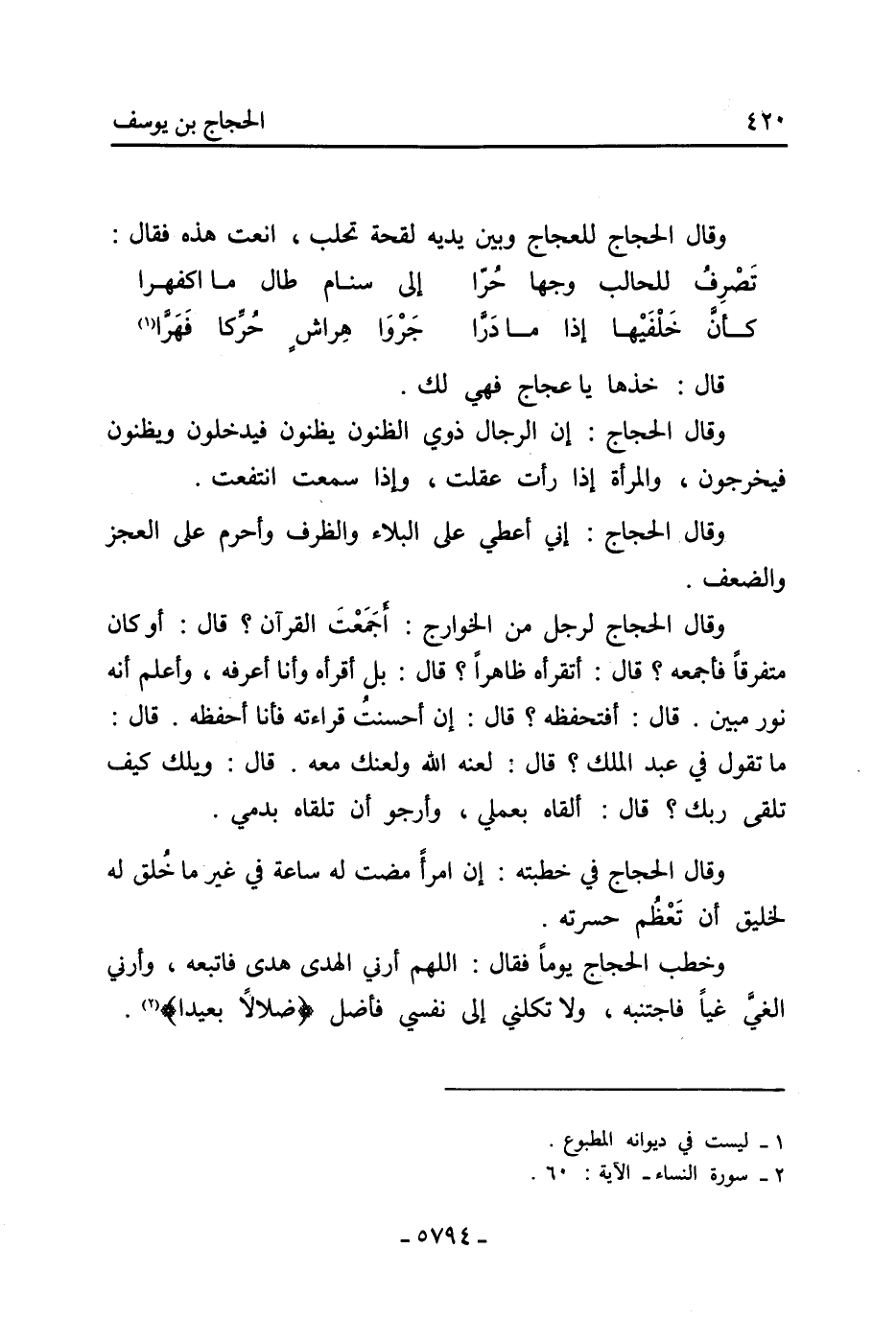 وقَالَ الحجاج لرجل من الخوارج: أَجَمَعْتَ القرآن؟ قَالَ: أَوْ كَانَ متفرقًا فأجمعه؟ قَالَ: أتقرأه ظاهرًا؟ قَالَ: بل أقرأه وأنا أعرفه، وأعلم أَنَّهُ نور مبين. قَالَ: أفتحفظه؟ قَالَ: إن أحسنتُ قراءته فأنا أحفظه. قَالَ: