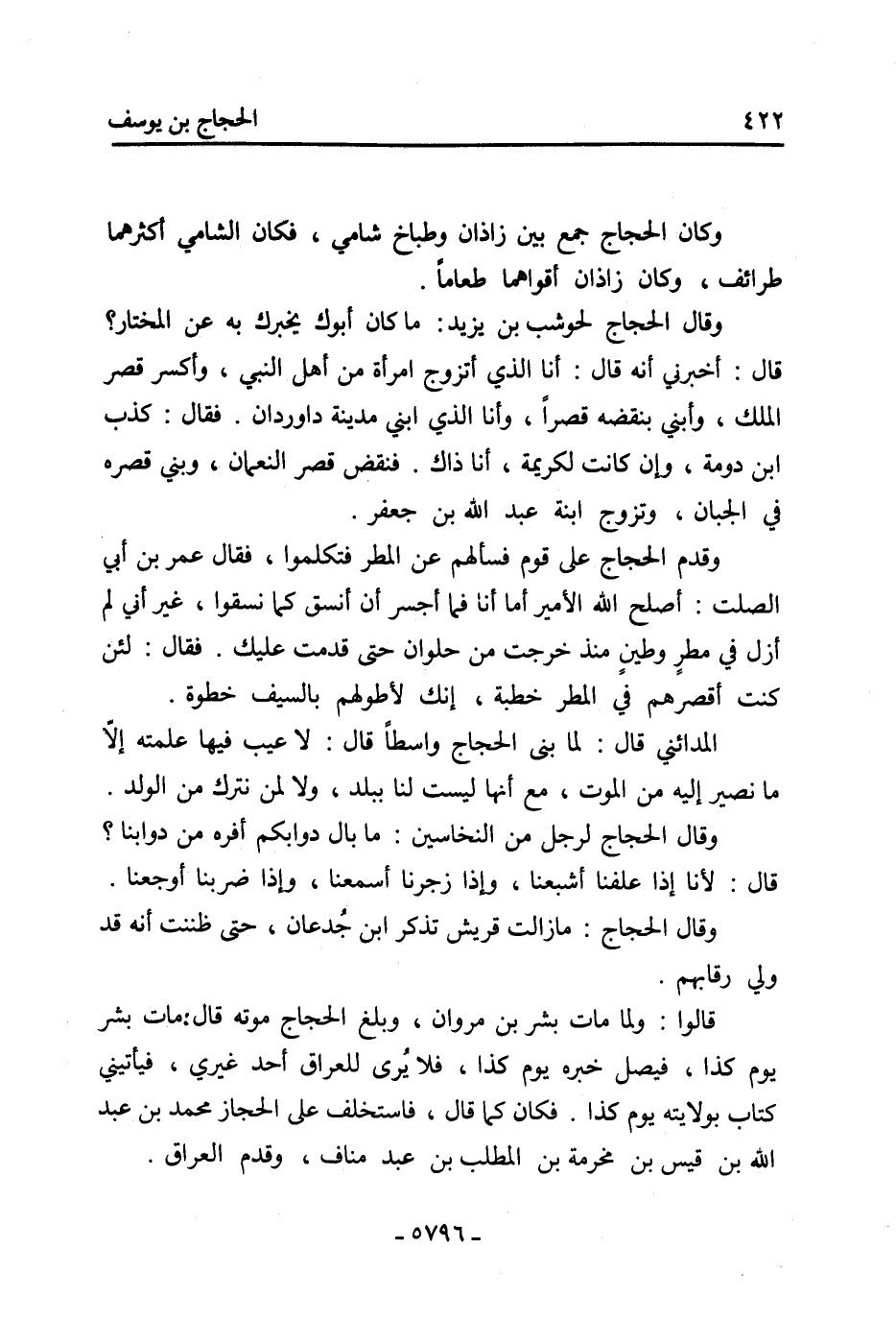 وكان الحجاج جمع بين زاذان وطباخ شامي، فكان الشامي أكثرهما طرائف، وكان زاذان أقواهما طعامًا.