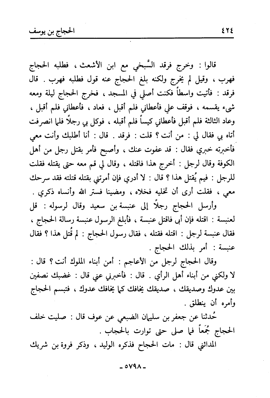 قَالُوا: وخرج فرقد السَّبخي مَعَ ابْنُ الأشعث، فطلبه الحجاج فهرب، وقيل لم يخرج ولكنه بلغ الحجاج عَنْهُ قول فطلبه فهرب. قَالَ فرقد: فأتيت واسطًا فكنت أصلي فِي المسجد، فخرج الحجاج ليلة ومعه شيء يقسمه، فوقف عليّ فأعطاني فلم أقبل، فعاد، فأعطاني فلم أقبل، وعاد الثالثة فلم أقبل فأعطاني كيسًا فلم أقبله، فوكل بي رجلًا فلما انصرفت أتاه بي فَقَالَ لي: من أنت؟ قلت: فرقد. قَالَ: أَنَا أطلبك وأنت معي فأخبرته خبري فَقَالَ: قَدْ عفوت عنك، وأصبح فأمر بقتل رَجُل من أهل الكوفة وقَالَ لرجل: أَخْرَج هَذَا فاقتله، وقَالَ لي قم معه حتَّى يقتله فقلت للرجل: فيم يُقتل هَذَا؟ قَالَ: لا أدري فإن أمرتني بقتله قتلته فقد سرحك معي، فقلت أرى أن تخليه فخلاه، ومضينا فستر اللَّه وأنساه ذكري.