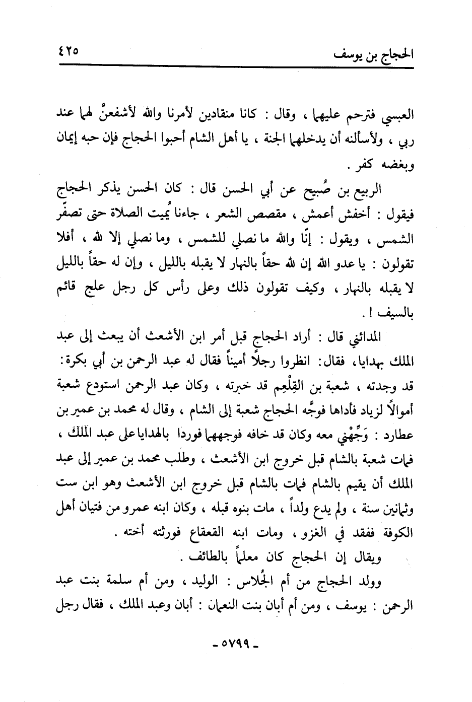 الربيع بْن صبيح عن أبي الْحَسَن قَالَ: كَانَ الْحَسَن يذكر الحجاج فيقول: أخفش أعمش، مقصص الشعر، جاءنا يُميت الصلاة حتَّى تصفّر الشمس، ويقول: إنّا والله ما نصلي للشمس، وما نصلي إلا للَّه، أفلا تقولون: يا عدو اللَّه إن لله حقًا بالنهار لا يقبله بالليل، وإن لَهُ حقا بالليل لا يقبله بالنهار، وكيف تقولون ذَلِكَ وعلى رأس كل رَجُل علج قائم بالسيفّ!.