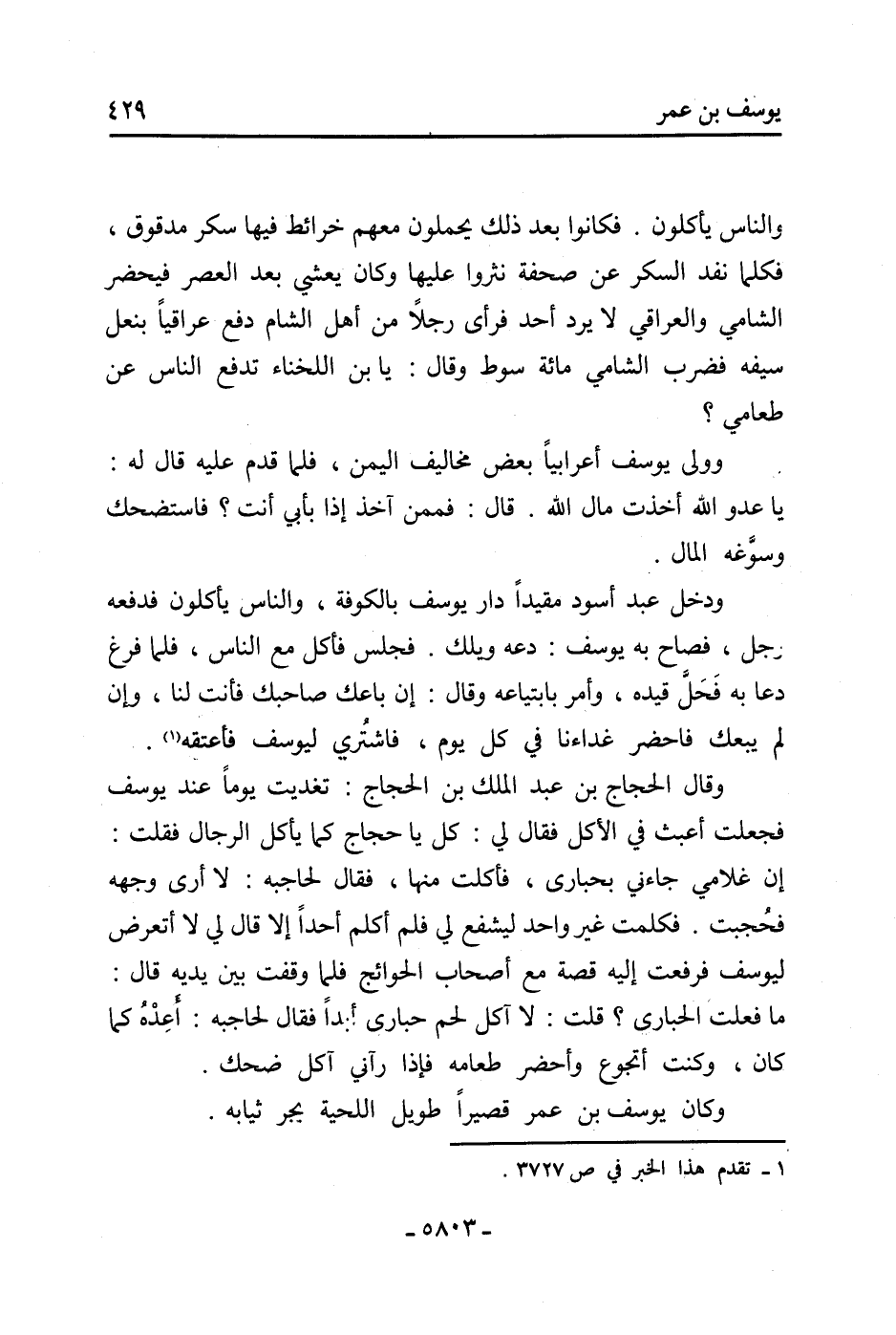 والناس يأكلون. فكانوا بعد ذَلِكَ يحملون معهم خرائط فيها سكر مدقوق، فكلما نفد السكر عن صفحة نثروا عليها وكان يعشي بعد العصر فيحضر الشامي والعراقي لا يرد أحد فرأى رجال من أهل الشام دفع عراقيًا بنعل سيفه فضرب الشامي مائة سوط وقال: يابن اللخناء تدفع النَّاس عن طعامي؟