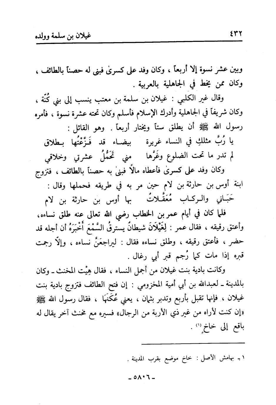 وكانت بادية بِنْت غيلان من أجمل النساء، فَقَالَ هِيت المخنث- وكان بالمدينة- لعبد اللَّه بْن أبي أمية المخزومي: إن فتح الطائف فتزوج بادية بِنْت غيلان، فإنها تقبل بأربع وتدبر بثمان، يعني عُكَنَهَا، [فَقَالَ رسول الله صَلَّى اللَّهُ عَلَيْهِ وَسَلَّمَ «إن كنت لأراه من غير ذي الأربة من الرجال] » فسيره مَعَ مخنث آخر يقال له باقع إلى خاخ [1] .
