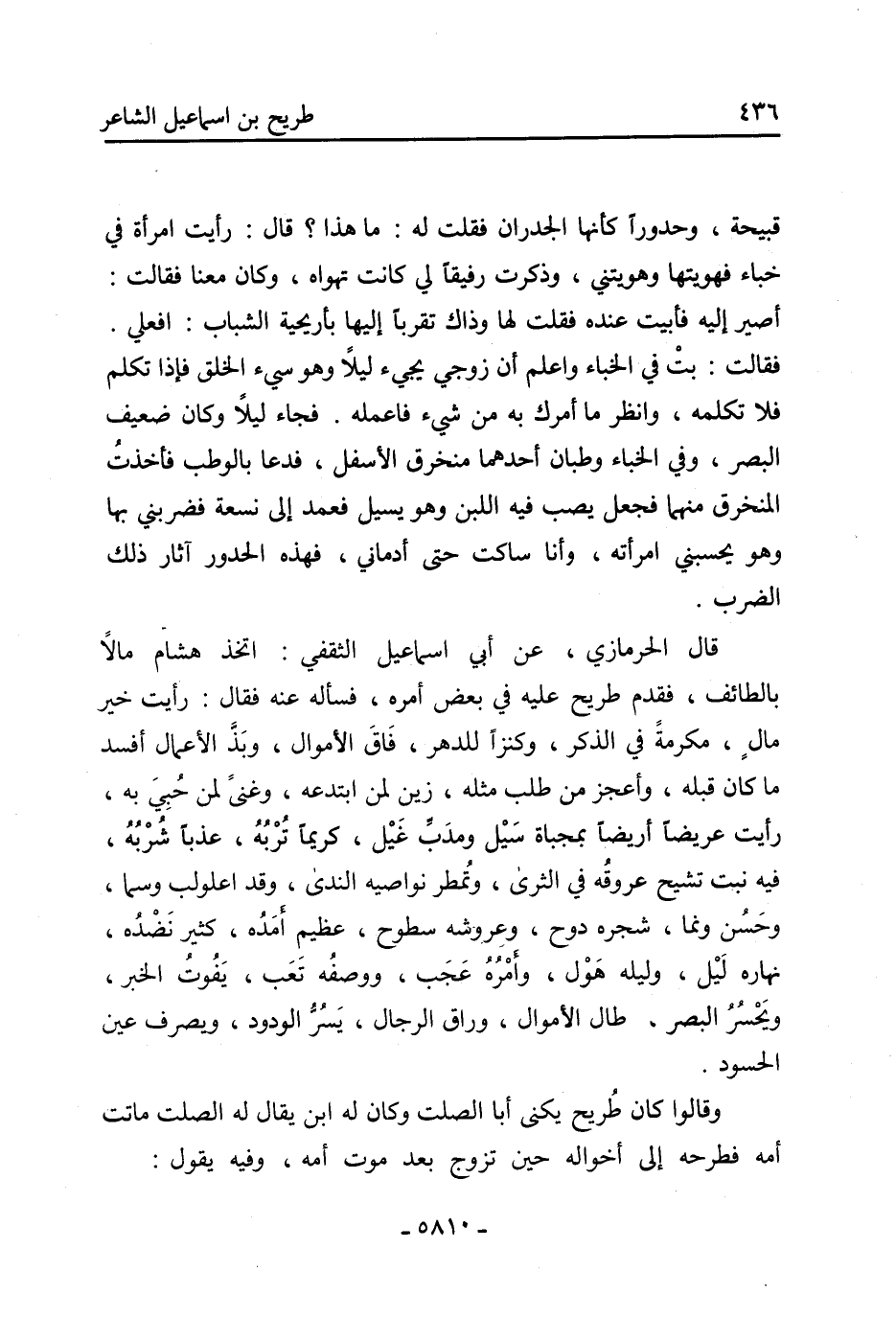 قَالَ الحرمازي، عن أَبِي إِسْمَاعِيل الثقفي: اتخذ هشام مالًا بالطائف، فقدم طريح عَلَيْهِ فِي بعض أمره، فسأله عَنْهُ فقال: رَأَيْت خير مالٍ، مكرمةً فِي الذكر، وكنزًا للدهر، فَاقَ الأموال، وبَذَّ الأعمال أفسد ما كَانَ قبله، وأعجز من طلب مثله، زين لمن ابتدعه، وغنًى لمن حُبِيَ بِهِ، رَأَيْت عريضًا أريضًا بمجباة سَيْل ومدَبِّ غَيْل، كريمًا تربه، عذبا شربه، فيه نبت تشيح عروقُه فِي الثرى، وتُمطر نواصيه الندى، وَقَدِ اعلولب وسما، وحَسُن ونما، شجره دوح، وعروشه سطوح، عظيم أَمَدُه، كَثِير نَضْدُه، نهاره لَيْل، وليله هَوْل، وأمْرُهُ عَجَب، ووصفُه تَعَب، يَفُوتُ الخبر، ويَحْسُرُ البصر، طال الأموال، وراق الرجال، يَسُرُّ الودود، ويصرف عين الحسود.