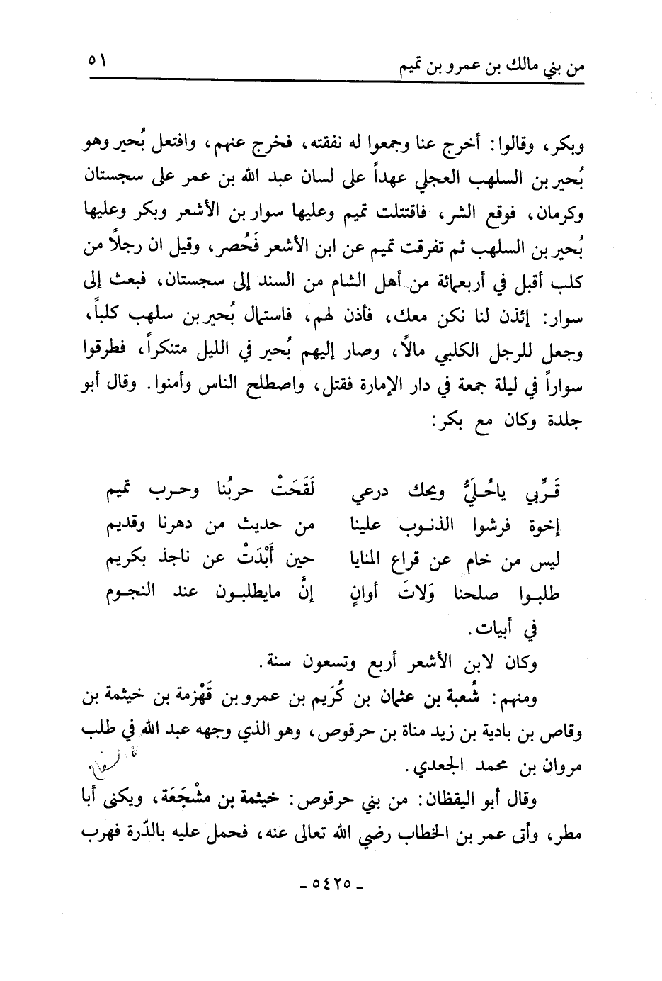 وبكر، وقالوا: أخرج عنا وجمعوا لَهُ نفقته، فخرج عَنْهُمْ، وافتعل بُحير وهو بُحير بْن السلهب العجلي عهدًا عَلَى لسان عَبْد اللَّه بْن عُمَر عَلَى سجستان وكرمان، فوقع الشر، فاقتتلت تميم وعليها سوار بْن الأشعر وبكر وعليها بُحير بْن السلهب ثُمَّ تفرقت تميم عن ابْنُ الأشعر فَحُصر، وقيل إن رجلًا من كلب أقبل في أربعمائة من أهل الشام من السند إلى سجستان، فبعث إلى سوار: إئْذن لنا نكن معك، فأذن لهم، فاستمال بُحير بْن سلهب كلبًا، وجعل للرجل الكلبي مالًا، وصار إليهم بُحير فِي الليل متنكرًا، فطرقوا سوارًا فِي ليلة جمعة فِي دار الإمارة فقتل، واصطلح النَّاس وأمنوا. وقَالَ أَبُو جلدة وكان مَعَ بَكْر: