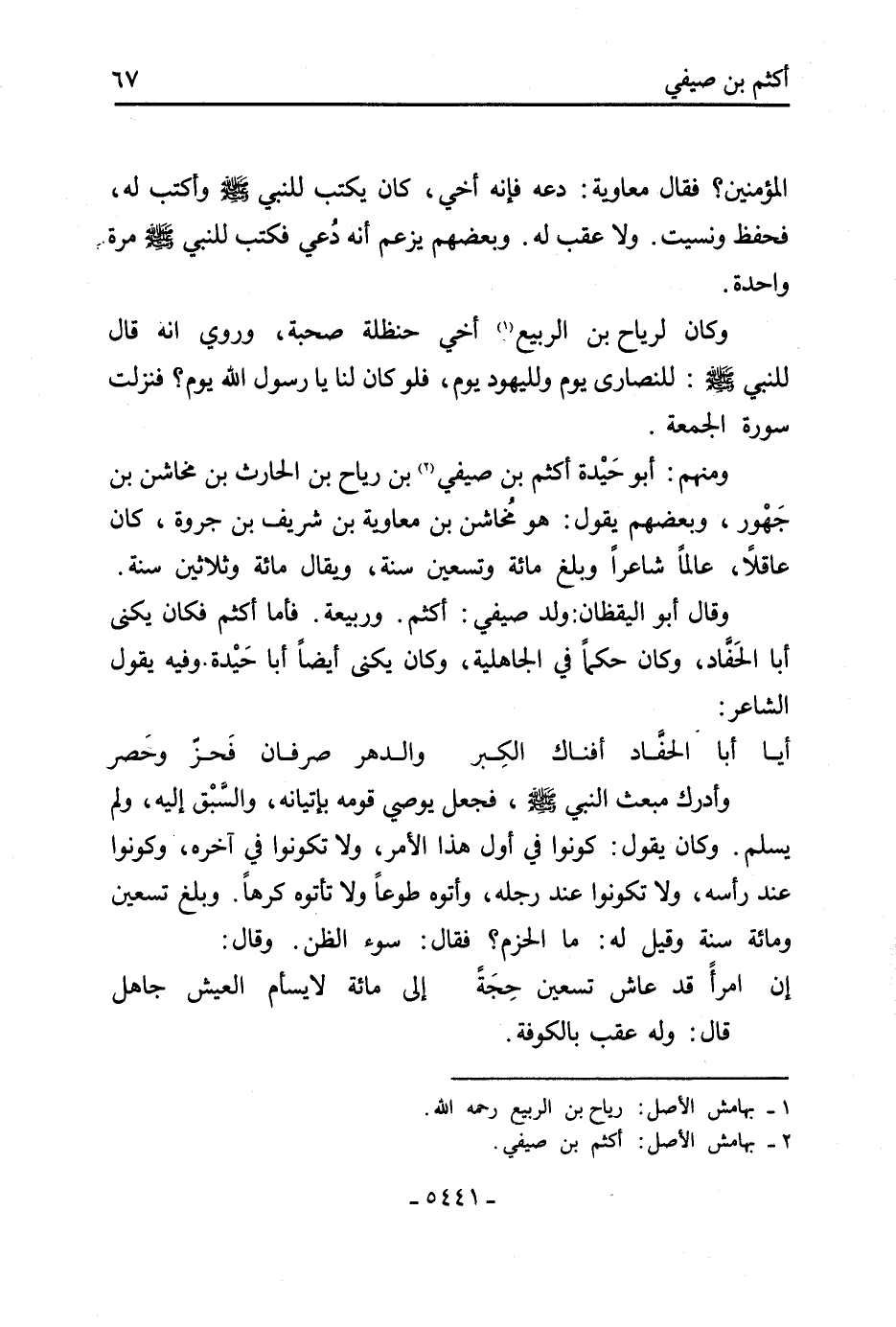وقَالَ أَبُو اليقظان: ولد صيفي: أكثم. وربيعة. فأمَّا أكثم فكان يكنى أبا الحَفَّاد، وكان حكمًا فِي الجاهلية، وكان يكنى أيضًا أبا حَيْدة. وفيه يَقُولُ الشَّاعِر: