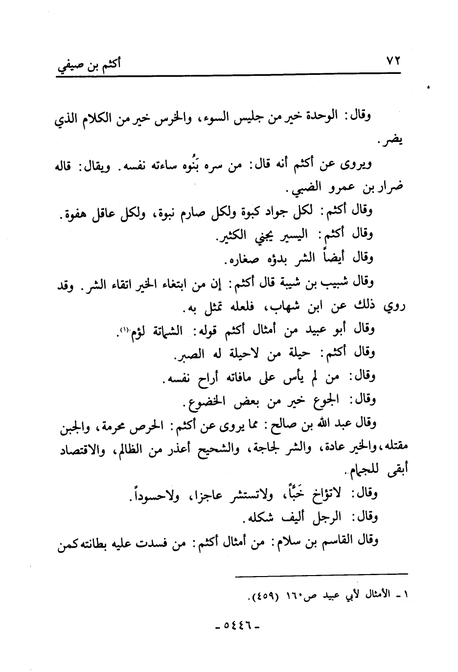 وقَالَ عَبْد اللَّه بْن صالح: مما يروى عن أكثم: الحرص محرمة، والجبن مقتله، والخير عادة، والشر لجاجة، والشحيح أعذر من الظالم، والاقتصاد أبقى للجمام.