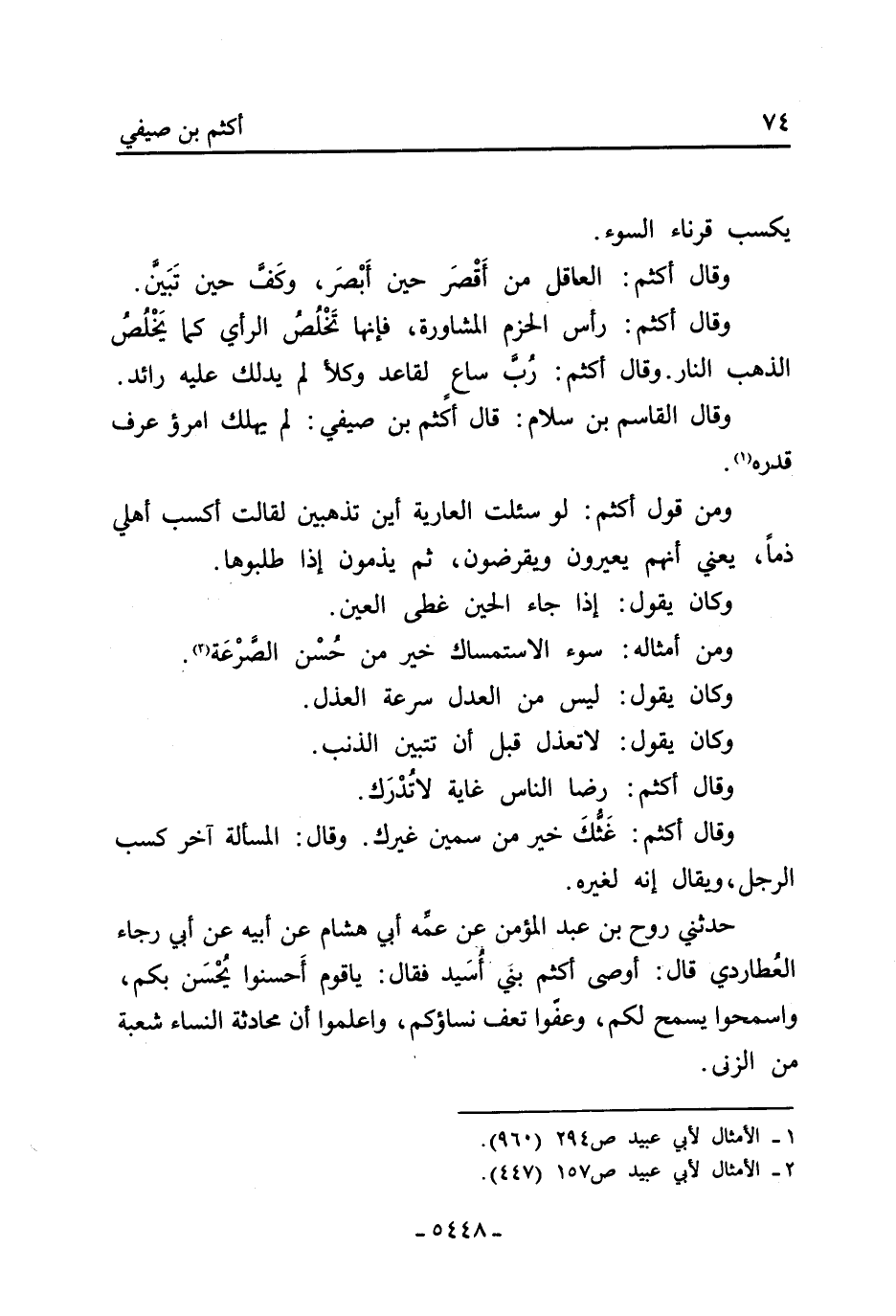 حَدَّثَنِي روح بْن عَبْد المؤمن عن عمِّه أَبِي هشام عن أَبِيهِ عن أَبِي رجاء العُطاردي قَالَ: أوصي أكثم بْني أُسَيد فَقَالَ: يا قوم أَحسنوا يُحْسن بكم، واسمحوا يسمح لكم، وعفّوا تعف نساؤكم، واعلموا أن محادثة النساء شعبة من الزنى.