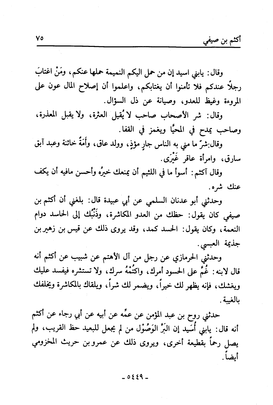 وحدَّثني أَبُو عدنان السلمي عن أَبِي عبيدة قَالَ: بلغني أن أكثم بْن صيفي كَانَ يَقُولُ: حظك من العدو المكاشرة، وذَنْبُك إلى الحاسد دوام النعمة، وكان يَقُولُ: الحسد كمد، وَقَدْ يروى ذَلِكَ عن قيس بْن زُهَيْر بْن جذيمة العبسي.