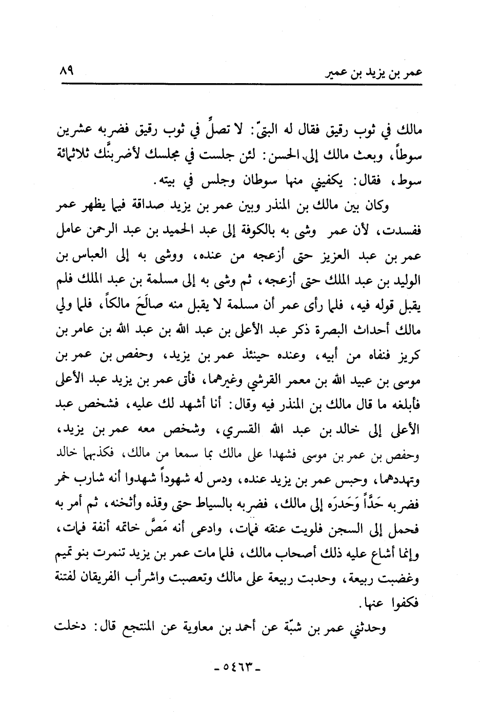 وكان بين مالك بْن المنذر وبين عُمَر بْن يزيد صداقة فيما يظهر عُمَر ففسدت، لأن عُمَر وشى بِهِ بالكوفة إلى عَبْد الحميد بْن عَبْد الرَّحْمَن عامل عُمَر بْن عَبْد العزيز حتَّى أزعجه من عنده، ووشى بِهِ إِلَى الْعَبَّاس بْن الْوَلِيد بْن عَبْدِ الْمَلِك حتَّى أزعجه، ثُمَّ وشى بِهِ إلى مسلمة بْن عَبْد الملك فلم يقبل قولُه فِيهِ، فلما رَأَى عُمَر أن مسلمة لا يقبل منه صالَحَ مالكًا، فلما ولي مالك أحداث البصرة ذكر عَبْد الأعلى بْن عَبْد اللَّه بْن عَبْد اللَّه بْن عامر بْن كريز فنفاه من أَبِيهِ، وعنده حينئذ عمر بن يزيد، وحفص بن عمر بن مُوسَى بْن عُبَيْد اللَّه بْن معمر الْقُرَشِيّ وغيرهما، فأتى عُمَر بْن يزيد عَبْد الأعلى فأبلغه ما قَالَ مالك بْن المنذر فِيهِ وقَالَ: أَنَا أشهد لَكَ عَلَيْهِ، فشخص عَبْد الأعلى إلى خَالِد بْن عَبْد اللَّه القسري، وشخص معه عُمَر بْن يزيد، وحفص بْن عُمَر بِنْ مُوسَى فشهدا عَلَى مالك بما سمعا من مالك، فكذبهما خَالِد وتهددهما، وحبس عُمَر بن يزيد عنده، ودس لَهُ شهودًا شهدوا أَنَّهُ شارب خمر فضربه حَدًّا وَحَدرَه إلى مالك، فضربه بالسياط حتَّى وقذه وأثخنه، ثُمَّ أمر بِهِ فحمل إلى السجن فلويت عنقه فمات، وادعى أَنَّهُ مَصَّ خاتمه أنفة فمات، وإنما أشاع عَلَيْهِ ذَلِكَ أصحاب مالك، فلما مات عُمَر بْن يزيد تنمرت بنو تميم وغضبت ربيعة، وحدبت ربيعة عَلَى مالك وتعصبت واشرأب الفريقان لفتنة، فكفوا عَنْهَا.