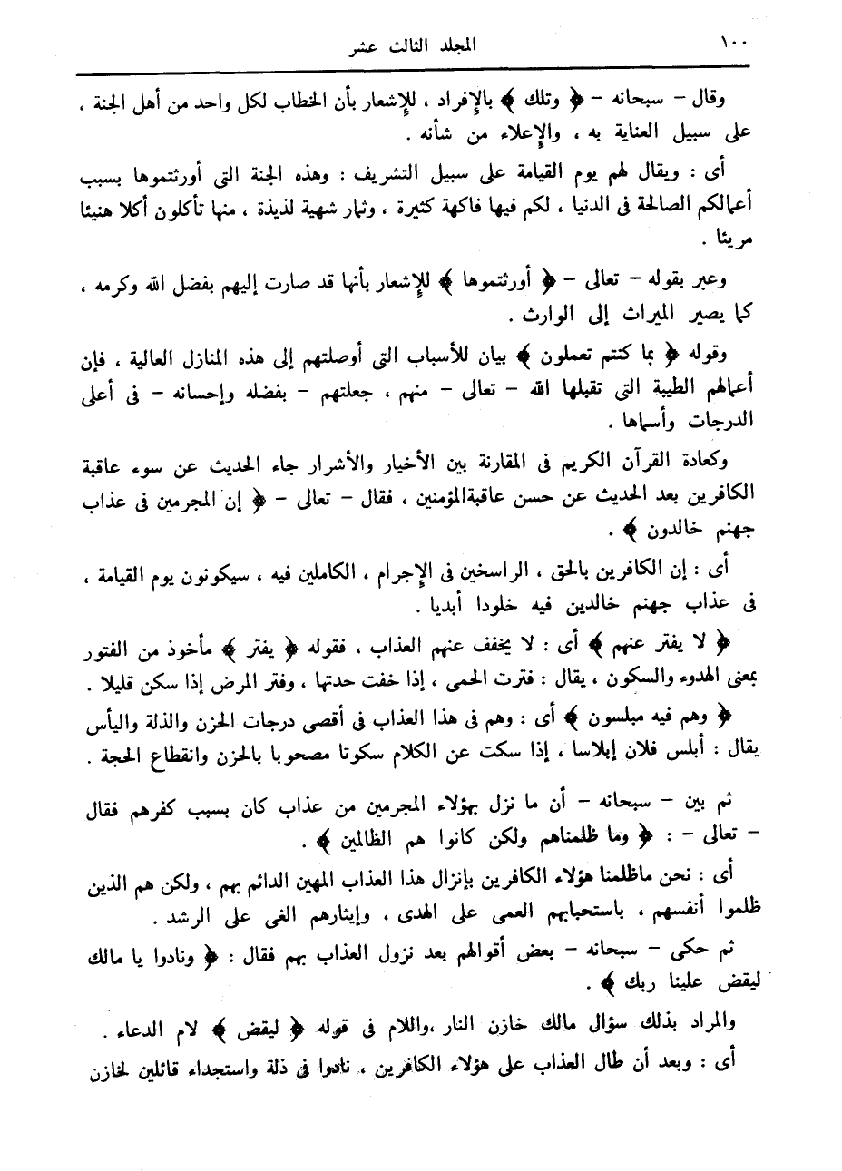 لا يُفَتَّرُ عَنْهُمْ أى: لا يخفف عنهم العذاب، فقوله يُفَتَّرُ مأخوذ من الفتور بمعنى الهدوء والسكون، يقال: فترت الحمى، إذا خفت حدتها، وفتر المرض إذا سكن قليلا.