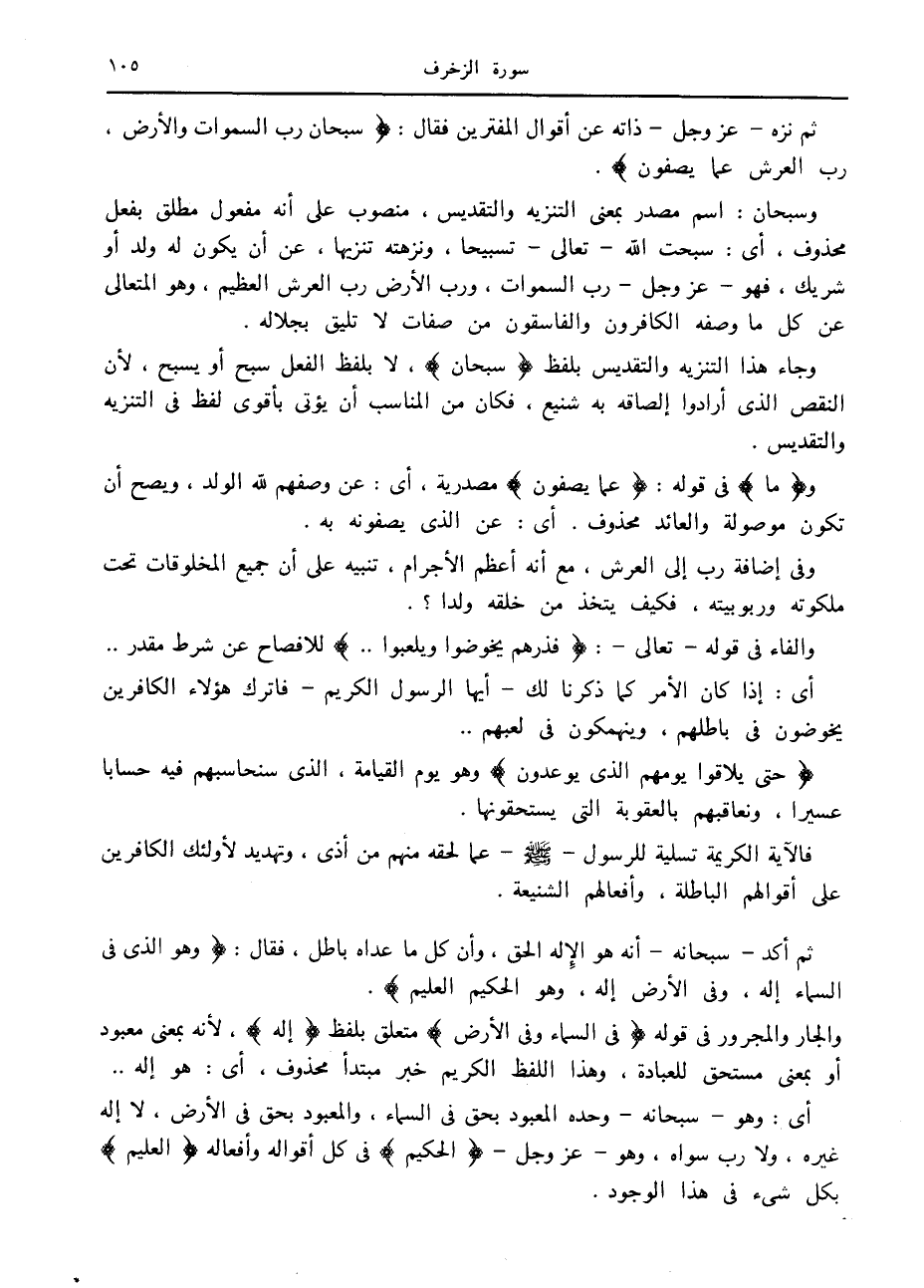 ثم نزه- عز وجل- ذاته عن أقوال المفترين فقال: سُبْحانَ رَبِّ السَّماواتِ وَالْأَرْضِ، رَبِّ الْعَرْشِ عَمَّا يَصِفُونَ.