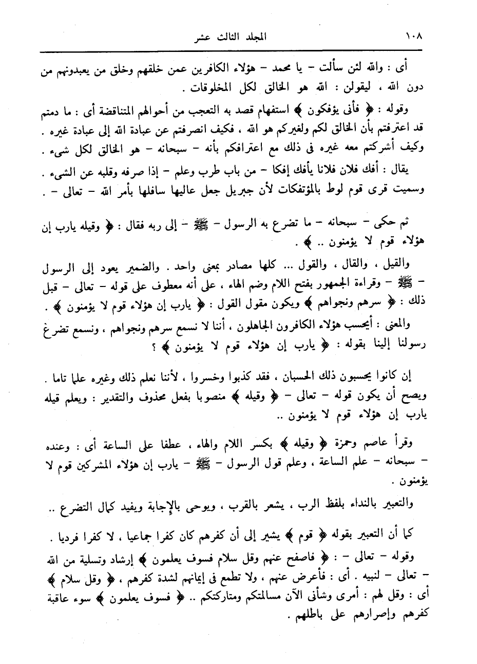 ثم حكى- سبحانه- ما تضرع به الرسول صلّى الله عليه وسلّم إلى ربه فقال: وَقِيلِهِ يا رَبِّ إِنَّ هؤُلاءِ قَوْمٌ لا يُؤْمِنُونَ ...