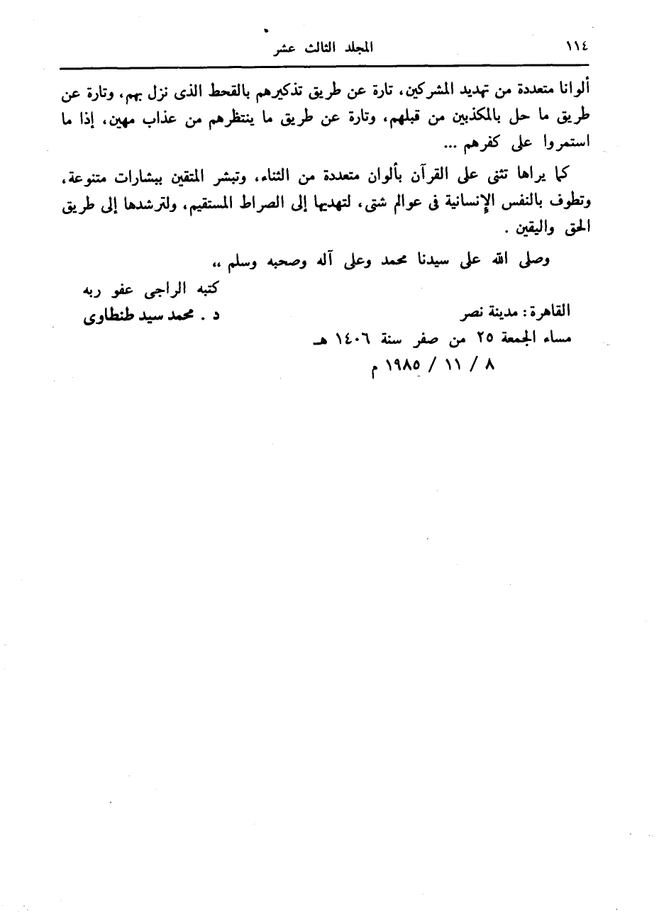 وصلى الله على سيدنا محمد وعلى آله وصحبه وسلم،، كتبه الراجي عفو ربه القاهرة: مدينة نصر مساء الجمعة 25 من صفر سنة 1406 هـ د. محمد سيد طنطاوى 8/ 11/ 1985 م