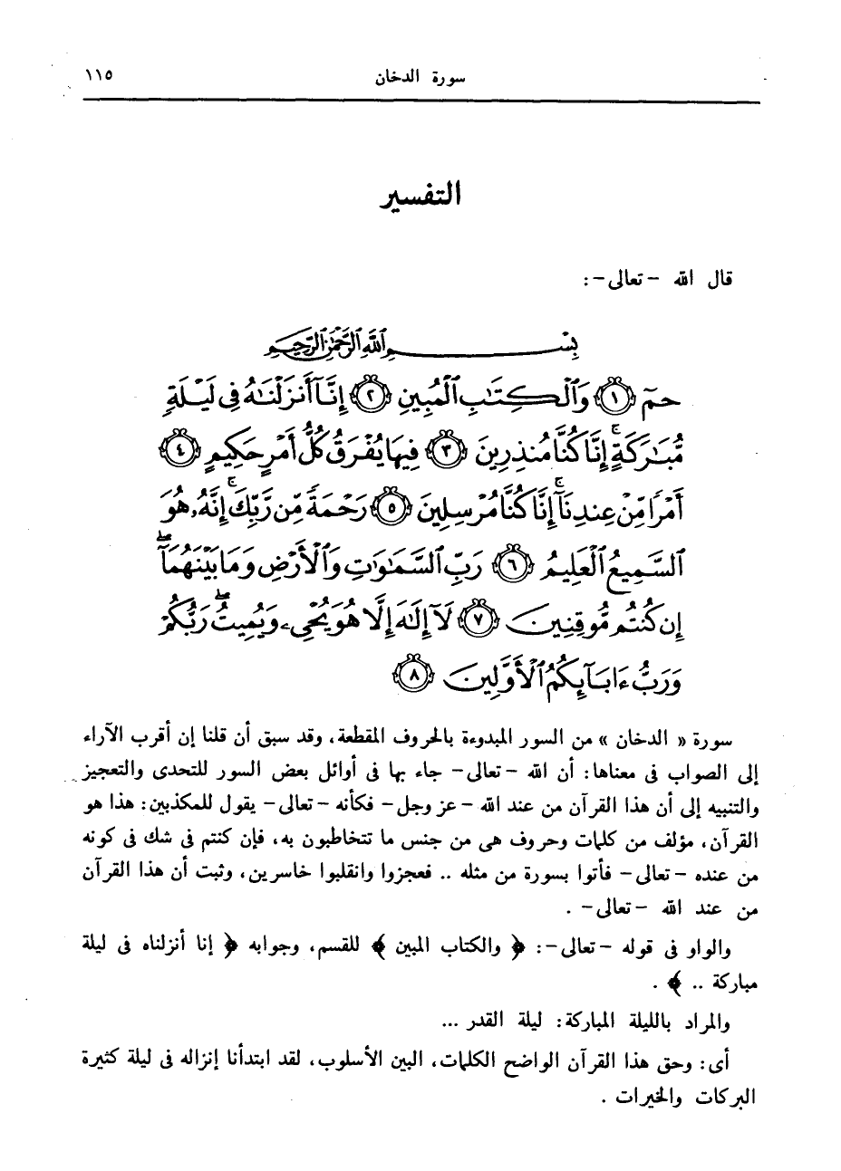 حم (1) وَالْكِتابِ الْمُبِينِ (2) إِنَّا أَنْزَلْناهُ فِي لَيْلَةٍ مُبارَكَةٍ إِنَّا كُنَّا مُنْذِرِينَ (3) فِيها يُفْرَقُ كُلُّ أَمْرٍ حَكِيمٍ (4)