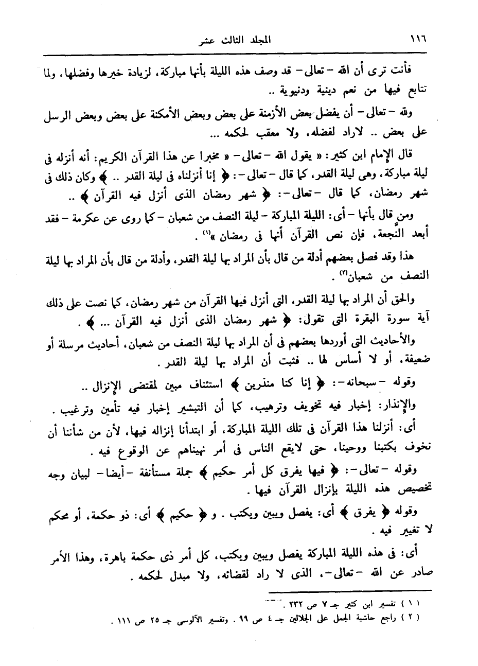 هذا وقد فصل بعضهم أدلة من قال بأن المراد بها ليلة القدر، وأدلة من قال بأن المراد بها ليلة النصف من شعبان «2» .