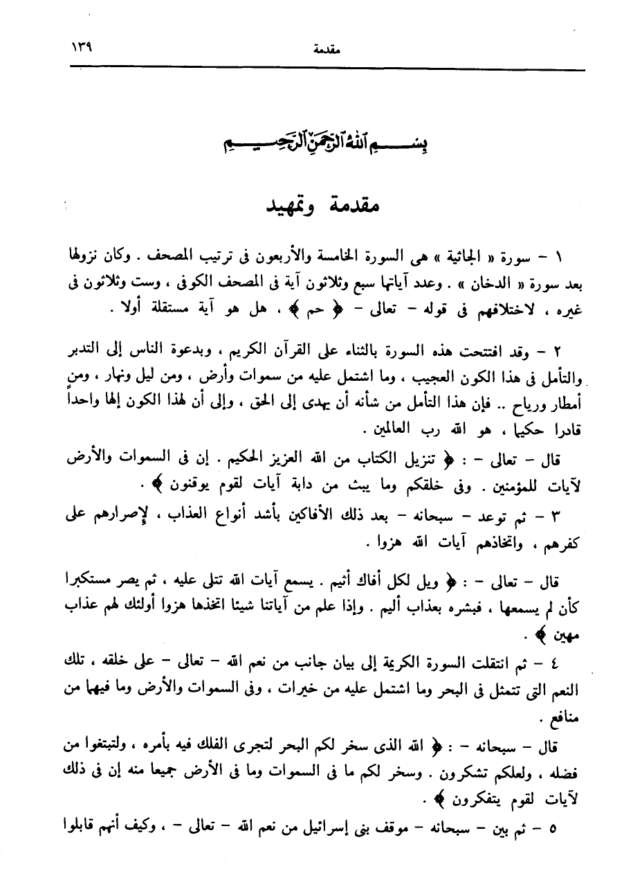 1- سورة «الجاثية» هي السورة الخامسة والأربعون في ترتيب المصحف. وكان نزولها بعد سورة «الدخان» . وعدد آياتها سبع وثلاثون آية في المصحف الكوفي، وست وثلاثون في غيره، لاختلافهم في قوله- تعالى- حم، هل هو آية مستقلة أولا.