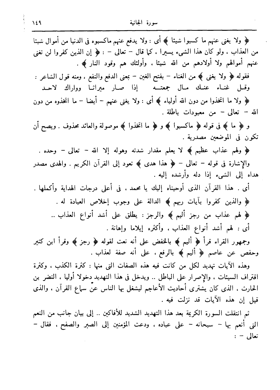 وَلا يُغْنِي عَنْهُمْ ما كَسَبُوا شَيْئاً أى: ولا يدفع عنهم ما كسبوه في الدنيا من أموال شيئا من العذاب، ولو كان هذا الشيء يسيرا، كما قال- تعالى-: إِنَّ الَّذِينَ كَفَرُوا لَنْ تُغْنِيَ عَنْهُمْ أَمْوالُهُمْ وَلا أَوْلادُهُمْ مِنَ اللَّهِ شَيْئاً، وَأُولئِكَ هُمْ وَقُودُ النَّارِ.