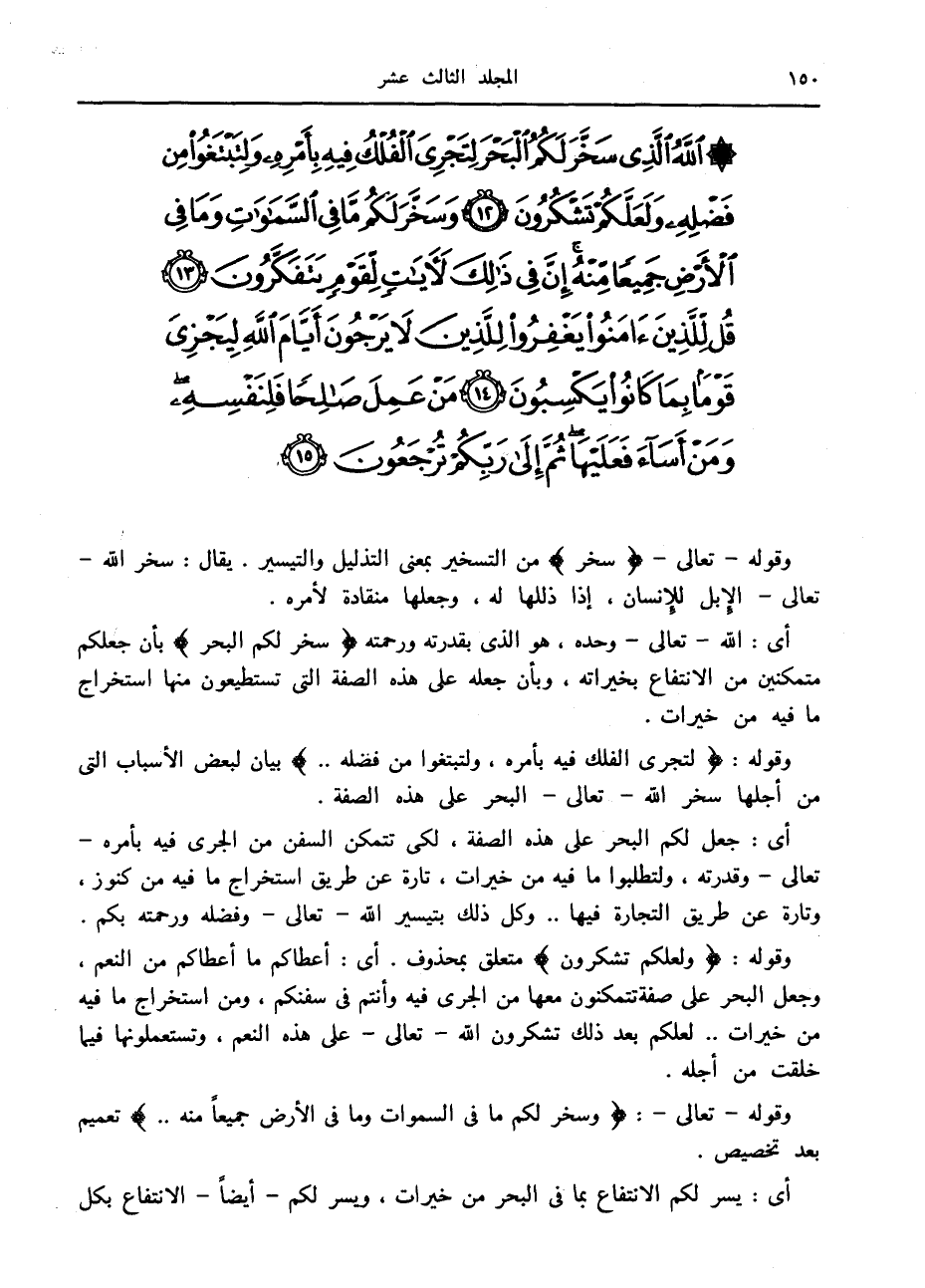 اللَّهُ الَّذِي سَخَّرَ لَكُمُ الْبَحْرَ لِتَجْرِيَ الْفُلْكُ فِيهِ بِأَمْرِهِ وَلِتَبْتَغُوا مِنْ فَضْلِهِ وَلَعَلَّكُمْ تَشْكُرُونَ (12) وَسَخَّرَ لَكُمْ ما فِي السَّماواتِ وَما فِي الْأَرْضِ جَمِيعاً مِنْهُ إِنَّ فِي ذلِكَ لَآياتٍ لِقَوْمٍ يَتَفَكَّرُونَ (13) قُلْ لِلَّذِينَ آمَنُوا يَغْفِرُوا لِلَّذِينَ لا يَرْجُونَ أَيَّامَ اللَّهِ لِيَجْزِيَ قَوْماً بِما كانُوا يَكْسِبُونَ (14) مَنْ عَمِلَ صالِحاً فَلِنَفْسِهِ وَمَنْ أَساءَ فَعَلَيْها ثُمَّ إِلى رَبِّكُمْ تُرْجَعُونَ (15)