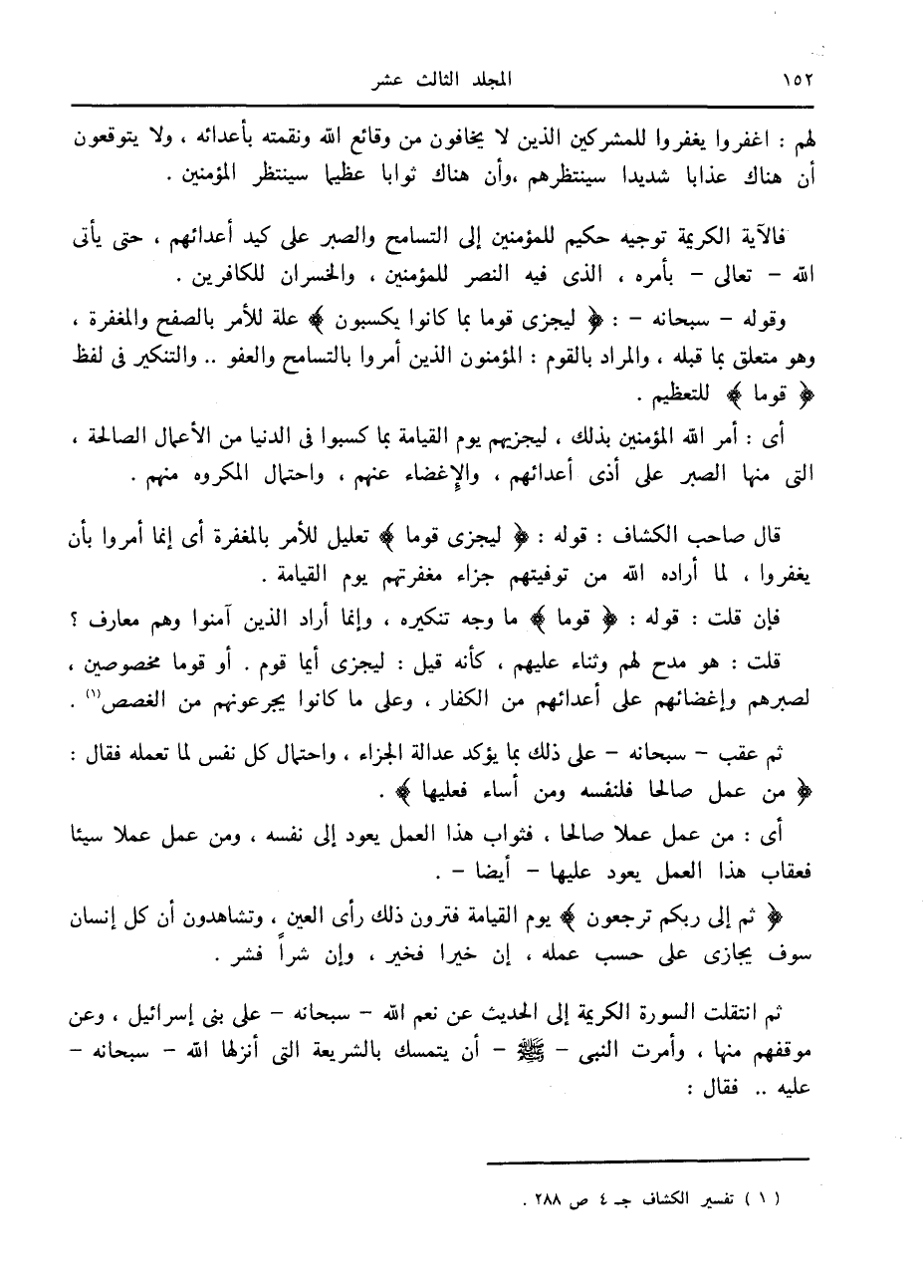 قال صاحب الكشاف: قوله: لِيَجْزِيَ قَوْماً تعليل للأمر بالمغفرة أى إنما أمروا بأن يغفروا، لما أراده الله من توفيتهم جزاء مغفرتهم يوم القيامة.