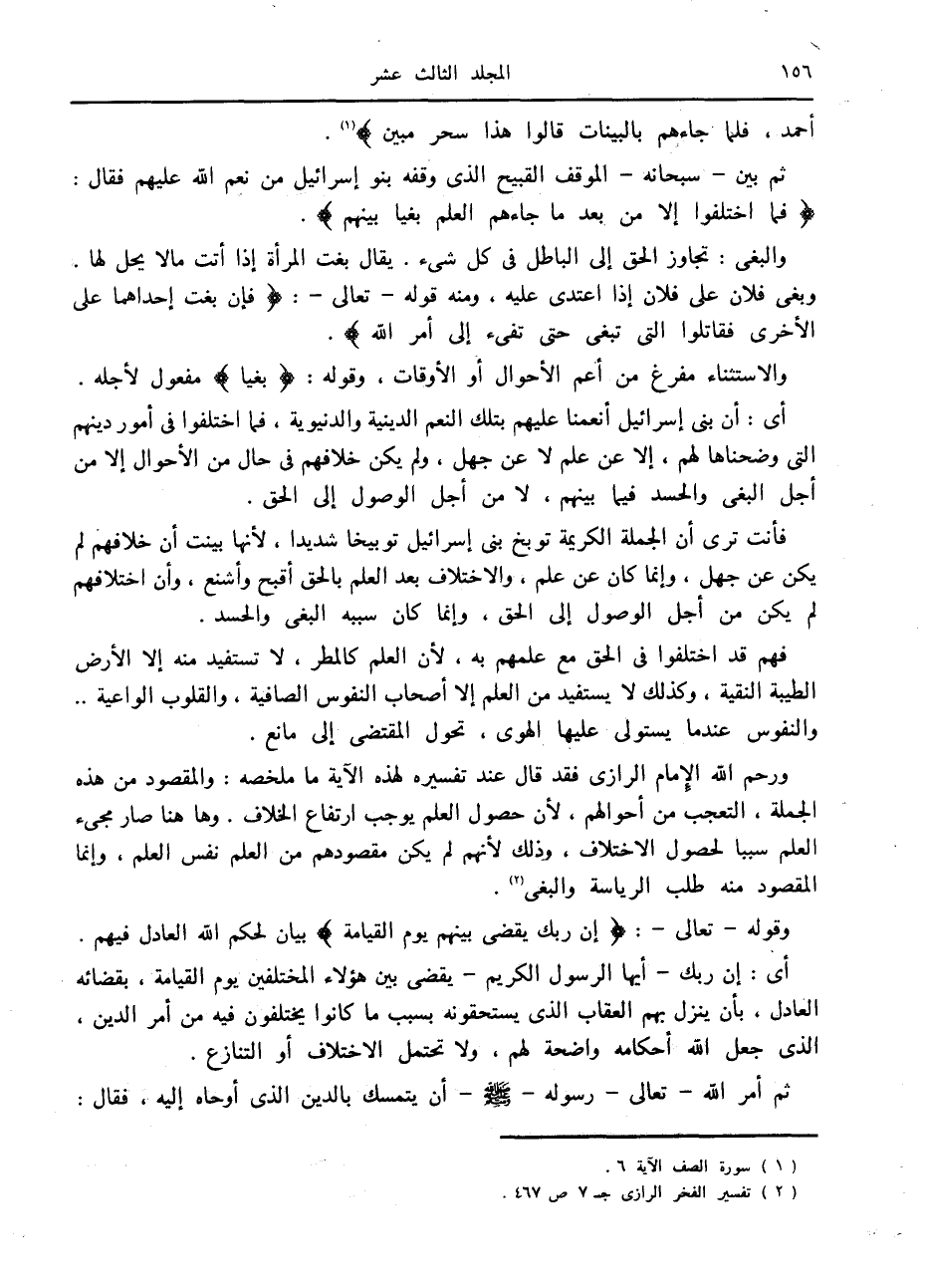 ورحم الله الإمام الرازي فقد قال عند تفسيره لهذه الآية ما ملخصه: والمقصود من هذه الجملة، التعجب من أحوالهم، لأن حصول العلم يوجب ارتفاع الخلاف. وهاهنا صار مجيء العلم سببا لحصول الاختلاف، وذلك لأنهم لم يكن مقصودهم من العلم نفس العلم، وإنما المقصود منه طلب الرياسة والبغي «2» .