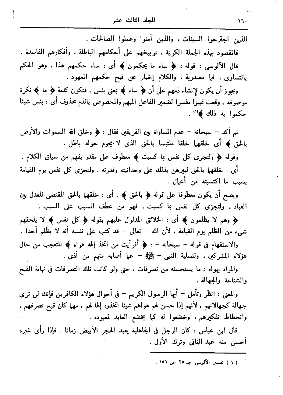 ويصح أن يكون معطوفا على قوله بِالْحَقِّ. أى: خلقهما بالحق المقتضى للعدل بين العباد، ولتجزى كل نفس بما كسبت، فهو من عطف المسبب على السبب.