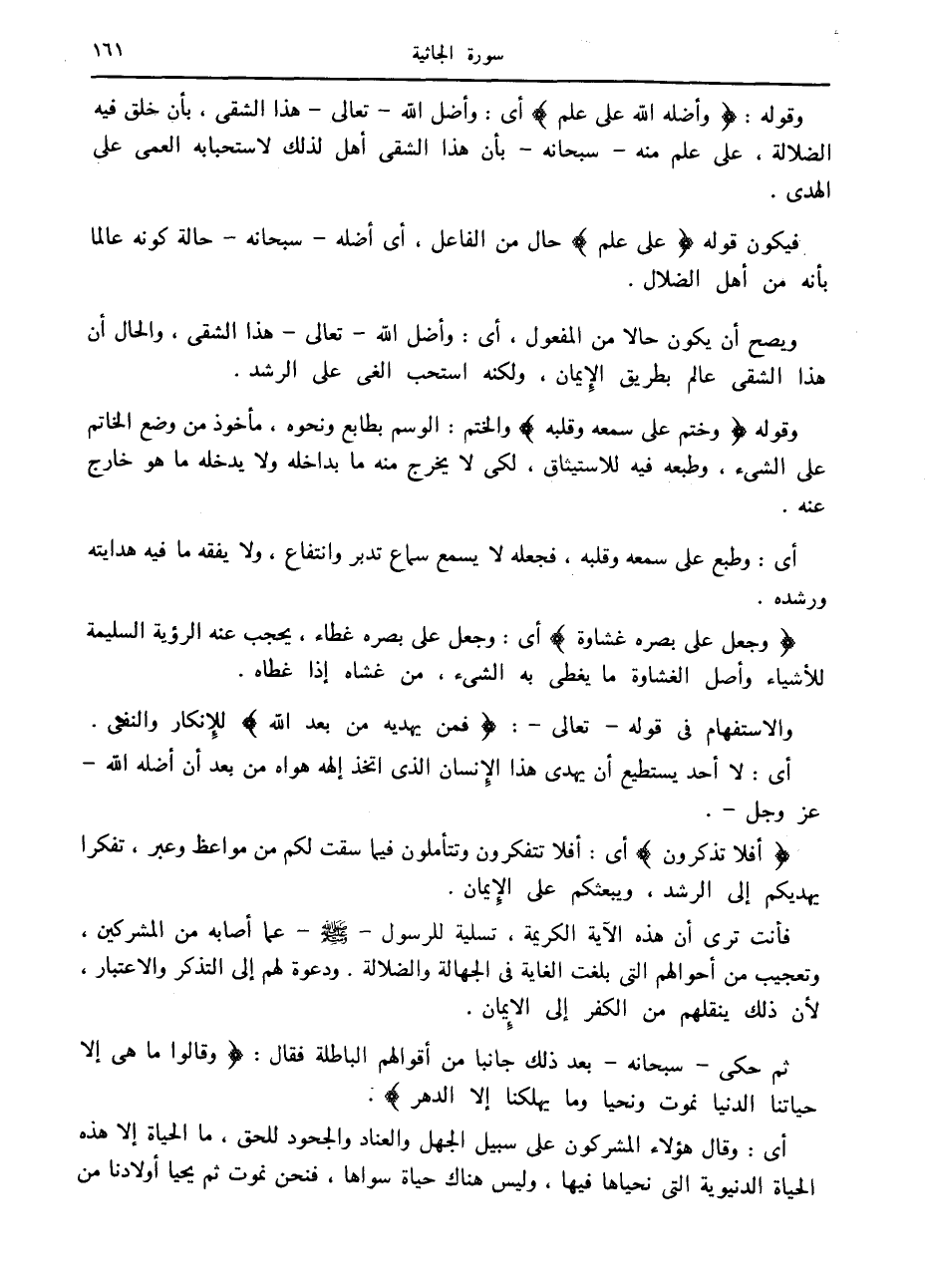وَجَعَلَ عَلى بَصَرِهِ غِشاوَةً أى: وجعل على بصره غطاء، يحجب عنه الرؤية السليمة للأشياء وأصل الغشاوة ما يغطى به الشيء، من غشاه إذا غطاه.