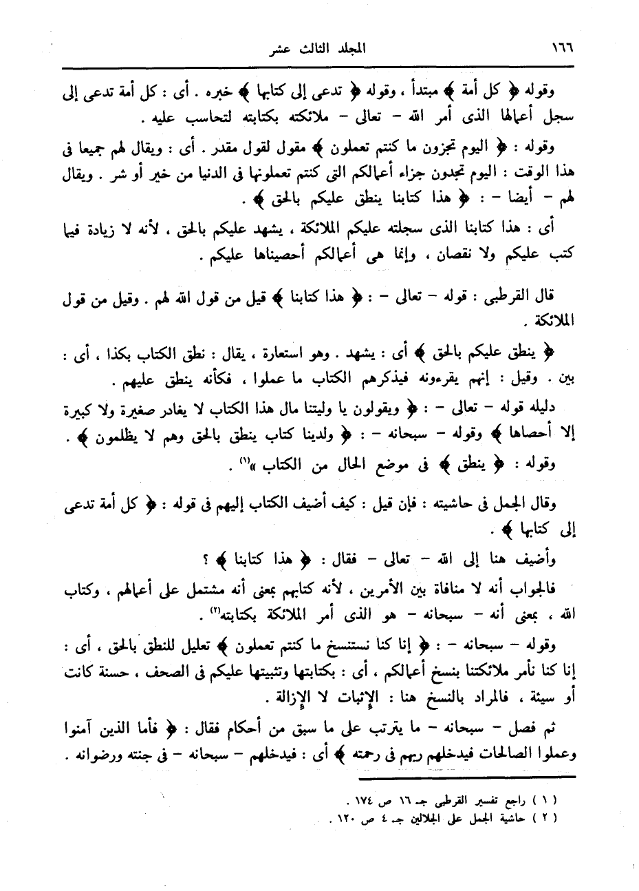 وقال الجمل في حاشيته: فإن قيل: كيف أضيف الكتاب إليهم في قوله: كُلُّ أُمَّةٍ تُدْعى إِلى كِتابِهَا.