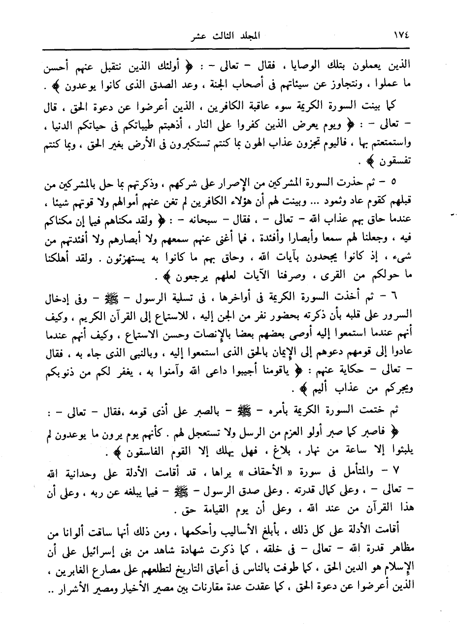 7- والمتأمل في سورة «الأحقاف» يراها، قد أقامت الأدلة على وحدانية الله- تعالى-، وعلى كمال قدرته. وعلى صدق الرسول صلّى الله عليه وسلّم فيما يبلغه عن ربه، وعلى أن هذا القرآن من عند الله، وعلى أن يوم القيامة حق.