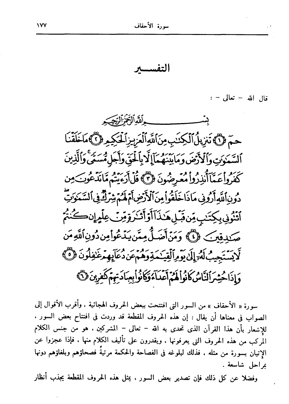 حم (1) تَنْزِيلُ الْكِتابِ مِنَ اللَّهِ الْعَزِيزِ الْحَكِيمِ (2) ما خَلَقْنَا السَّماواتِ وَالْأَرْضَ وَما بَيْنَهُما إِلاَّ بِالْحَقِّ وَأَجَلٍ مُسَمًّى وَالَّذِينَ كَفَرُوا عَمَّا أُنْذِرُوا مُعْرِضُونَ (3) قُلْ أَرَأَيْتُمْ ما تَدْعُونَ مِنْ دُونِ اللَّهِ أَرُونِي ماذا خَلَقُوا مِنَ الْأَرْضِ أَمْ لَهُمْ شِرْكٌ فِي السَّماواتِ ائْتُونِي بِكِتابٍ مِنْ قَبْلِ هذا أَوْ أَثارَةٍ مِنْ عِلْمٍ إِنْ كُنْتُمْ صادِقِينَ (4)