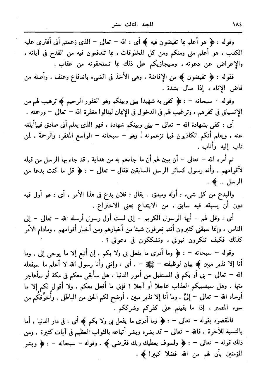 وقوله: هُوَ أَعْلَمُ بِما تُفِيضُونَ فِيهِ أى: الله- تعالى- الذي زعمتم أنى أفترى عليه الكذب، هو أعلم منى ومنكم ومن كل المخلوقات، بما تندفعون فيه من القدح في آياته، والإعراض عن دعوته، وسيجازيكم على ذلك بما تستحقونه من عقاب.