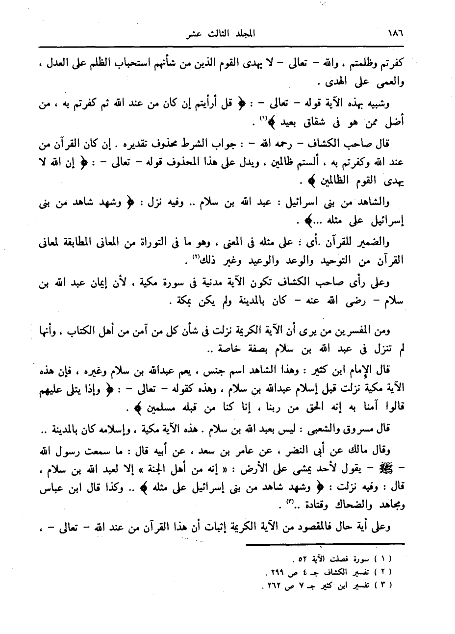 وعلى رأى صاحب الكشاف تكون الآية مدنية في سورة مكية، لأن إيمان عبد الله بن سلام- رضى الله عنه- كان بالمدينة ولم يكن بمكة.
