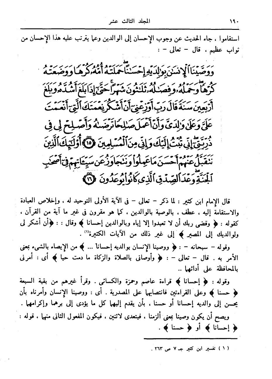 وَوَصَّيْنَا الْإِنْسانَ بِوالِدَيْهِ إِحْساناً حَمَلَتْهُ أُمُّهُ كُرْهاً وَوَضَعَتْهُ كُرْهاً وَحَمْلُهُ وَفِصالُهُ ثَلاثُونَ شَهْراً حَتَّى إِذا بَلَغَ أَشُدَّهُ وَبَلَغَ أَرْبَعِينَ سَنَةً قالَ رَبِّ أَوْزِعْنِي أَنْ أَشْكُرَ نِعْمَتَكَ الَّتِي أَنْعَمْتَ عَلَيَّ وَعَلى والِدَيَّ وَأَنْ أَعْمَلَ صالِحاً تَرْضاهُ وَأَصْلِحْ لِي فِي ذُرِّيَّتِي إِنِّي تُبْتُ إِلَيْكَ وَإِنِّي مِنَ الْمُسْلِمِينَ (15) أُولئِكَ الَّذِينَ نَتَقَبَّلُ عَنْهُمْ أَحْسَنَ ما عَمِلُوا وَنَتَجاوَزُ عَنْ سَيِّئاتِهِمْ فِي أَصْحابِ الْجَنَّةِ وَعْدَ الصِّدْقِ الَّذِي كانُوا يُوعَدُونَ (16)