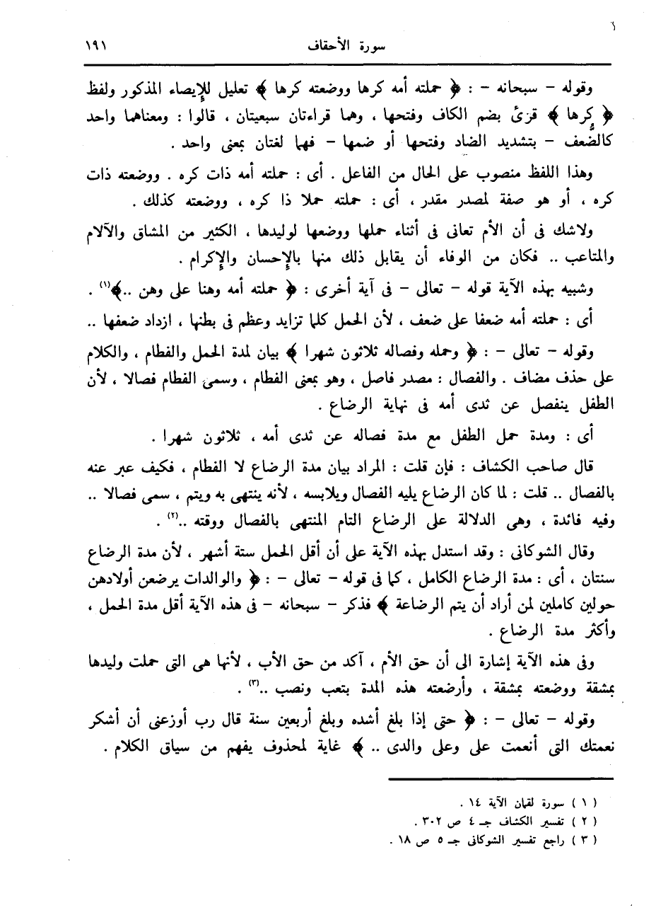 وقال الشوكانى: وقد استدل بهذه الآية على أن أقل الحمل ستة أشهر، لأن مدة الرضاع سنتان، أى: مدة الرضاع الكامل، كما في قوله- تعالى-: وَالْوالِداتُ يُرْضِعْنَ أَوْلادَهُنَّ حَوْلَيْنِ كامِلَيْنِ لِمَنْ أَرادَ أَنْ يُتِمَّ الرَّضاعَةَ فذكر- سبحانه- في هذه الآية أقل مدة الحمل، وأكثر مدة الرضاع.