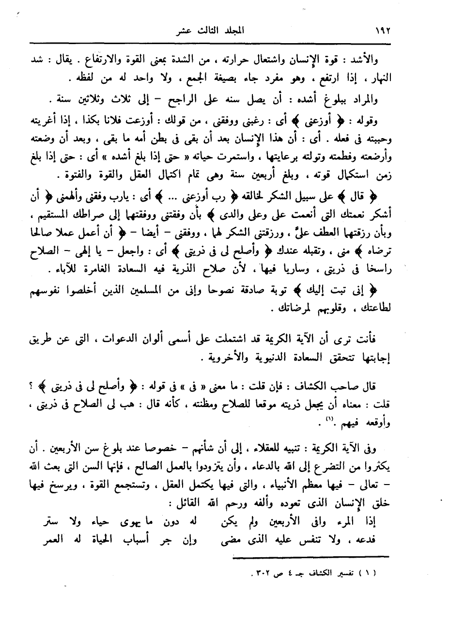 وقوله: أَوْزِعْنِي أى: رغبني ووفقني، من قولك: أوزعت فلانا بكذا، إذا أغريته وحببته في فعله. أى: أن هذا الإنسان بعد أن بقي في بطن أمه ما بقي، وبعد أن وضعته وأرضعته وفطمته وتولته برعايتها، واستمرت حياته «حتى إذا بلغ أشده» أى: حتى إذا بلغ زمن استكمال قوته، وبلغ أربعين سنة وهي تمام اكتمال العقل والقوة والفتوة.