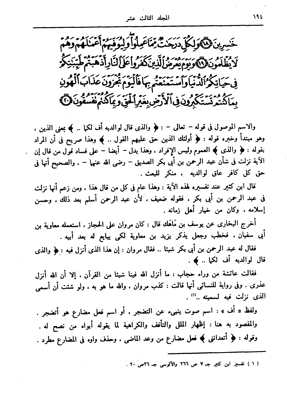 فقال له عبد الرحمن بن أبى بكر شيئا.. فقال مروان: إن هذا الذي أنزل فيه: وَالَّذِي قالَ لِوالِدَيْهِ أُفٍّ لَكُما ...