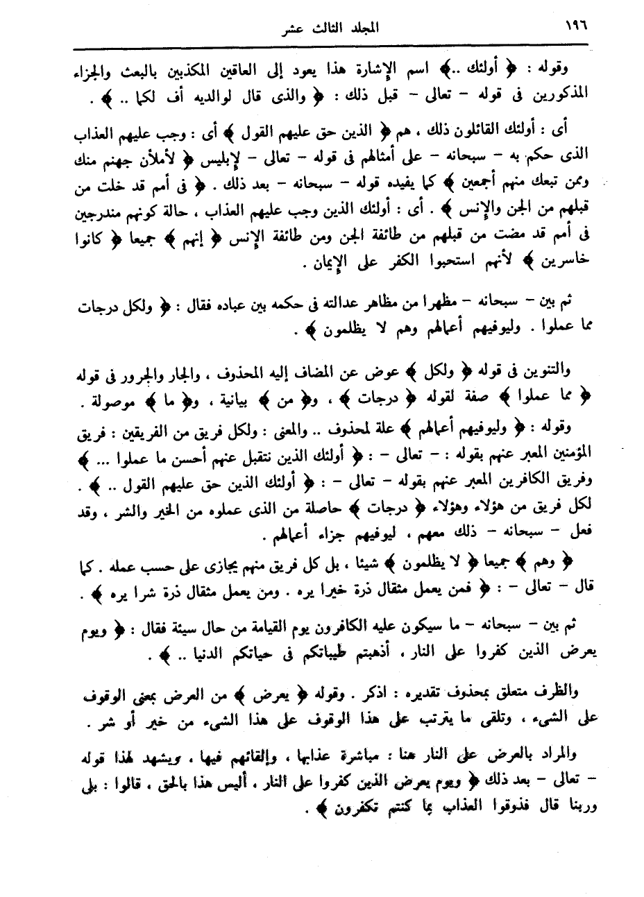 ثم بين- سبحانه- مظهرا من مظاهر عدالته في حكمه بين عباده فقال: وَلِكُلٍّ دَرَجاتٌ مِمَّا عَمِلُوا. وَلِيُوَفِّيَهُمْ أَعْمالَهُمْ وَهُمْ لا يُظْلَمُونَ.