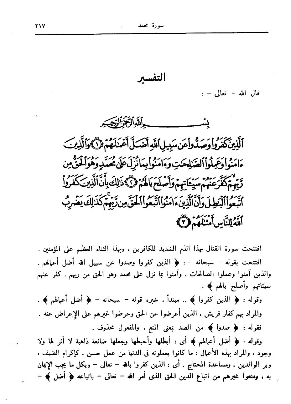 الَّذِينَ كَفَرُوا وَصَدُّوا عَنْ سَبِيلِ اللَّهِ أَضَلَّ أَعْمالَهُمْ (1) وَالَّذِينَ آمَنُوا وَعَمِلُوا الصَّالِحاتِ وَآمَنُوا بِما نُزِّلَ عَلى مُحَمَّدٍ وَهُوَ الْحَقُّ مِنْ رَبِّهِمْ كَفَّرَ عَنْهُمْ سَيِّئاتِهِمْ وَأَصْلَحَ بالَهُمْ (2) ذلِكَ بِأَنَّ الَّذِينَ كَفَرُوا اتَّبَعُوا الْباطِلَ وَأَنَّ الَّذِينَ آمَنُوا اتَّبَعُوا الْحَقَّ مِنْ رَبِّهِمْ كَذلِكَ يَضْرِبُ اللَّهُ لِلنَّاسِ أَمْثالَهُمْ (3)
