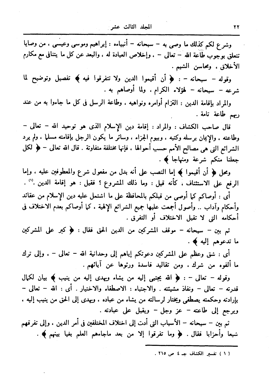 قال صاحب الكشاف: والمراد: إقامة دين الإسلام الذي هو توحيد الله- تعالى- وطاعته، والإيمان برسله وكتبه، وبيوم الجزاء، وسائر ما يكون الرجل بإقامته مسلما، ولم يرد الشرائع التي هي مصالح الأمم حسب أحوالها، فإنها مختلفة متفاوتة. قال الله تعالى- لِكُلٍّ جَعَلْنا مِنْكُمْ شِرْعَةً وَمِنْهاجاً.
