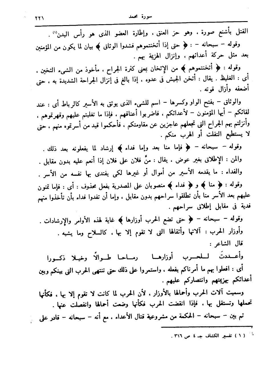 والوثاق- بفتح الواو وكسرها- اسم للشيء الذي يوثق به الأسير كالرباط أى: عند لقائكم- أيها المؤمنون- لأعدائكم، فاضربوا أعناقهم، فإذا ما تغلبتم عليهم وقهرتموهم، وأنزلتم بهم الجراح التي تجعلهم عاجزين عن مقاومتكم، فأحكموا قيد من أسرتموه منهم، حتى لا يستطيع التفلت أو الهرب منكم.