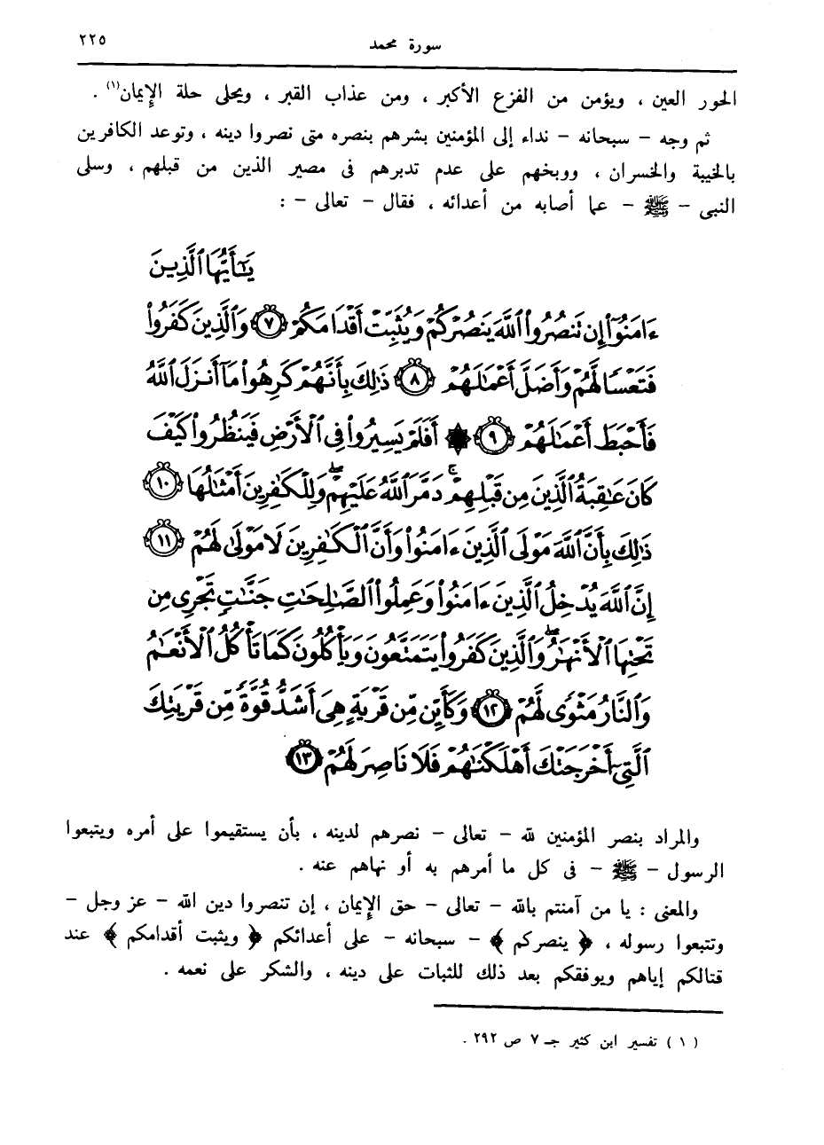 يا أَيُّهَا الَّذِينَ آمَنُوا إِنْ تَنْصُرُوا اللَّهَ يَنْصُرْكُمْ وَيُثَبِّتْ أَقْدامَكُمْ (7) وَالَّذِينَ كَفَرُوا فَتَعْساً لَهُمْ وَأَضَلَّ أَعْمالَهُمْ (8) ذلِكَ بِأَنَّهُمْ كَرِهُوا ما أَنْزَلَ اللَّهُ فَأَحْبَطَ أَعْمالَهُمْ (9) أَفَلَمْ يَسِيرُوا فِي الْأَرْضِ فَيَنْظُرُوا كَيْفَ كانَ عاقِبَةُ الَّذِينَ مِنْ قَبْلِهِمْ دَمَّرَ اللَّهُ عَلَيْهِمْ وَلِلْكافِرِينَ أَمْثالُها (10) ذلِكَ بِأَنَّ اللَّهَ مَوْلَى الَّذِينَ آمَنُوا وَأَنَّ الْكافِرِينَ لا مَوْلى لَهُمْ (11)